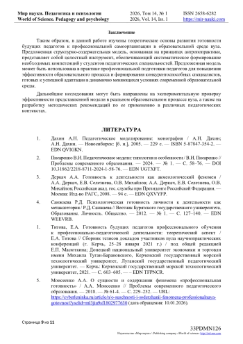 4. Санжаева Р.Д. Психологическая готовность личности к деятельности как метакатегория / Р.Д. Санжаева // Вестник Бурятского государственного университета. Образование. Личность. Общество. — 2012. — № 1. — С. 127–140. — EDN WEEVRB. Титова, Е.А. Готовность будущих педагогов профессионального обучения к профессионально-педагогической деятельности: теоретический аспект / Е.А. Титова // Сборник тезисов докладов участников пула научно-практических конференций (г. Керчь, 25–28 января 2021 г.) / под общей редакцией Е.П. Масюткина; Донецкий национальный университет экономики и торговли имени Михаила Туган-Барановского, Керченский государственный морской