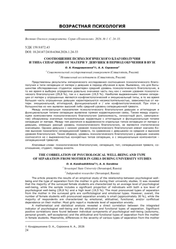 3. Гроголева О. Ю., Призерова Д. А. Психологическое благополучие студентов с различными типами сепарации и привязанности к родителям // Вестник Омского университета. Серия: Психология. - 2021. - № 3. - С. 6-17. -. DOI: 10.24147/2410-6364.2021.3.6-17