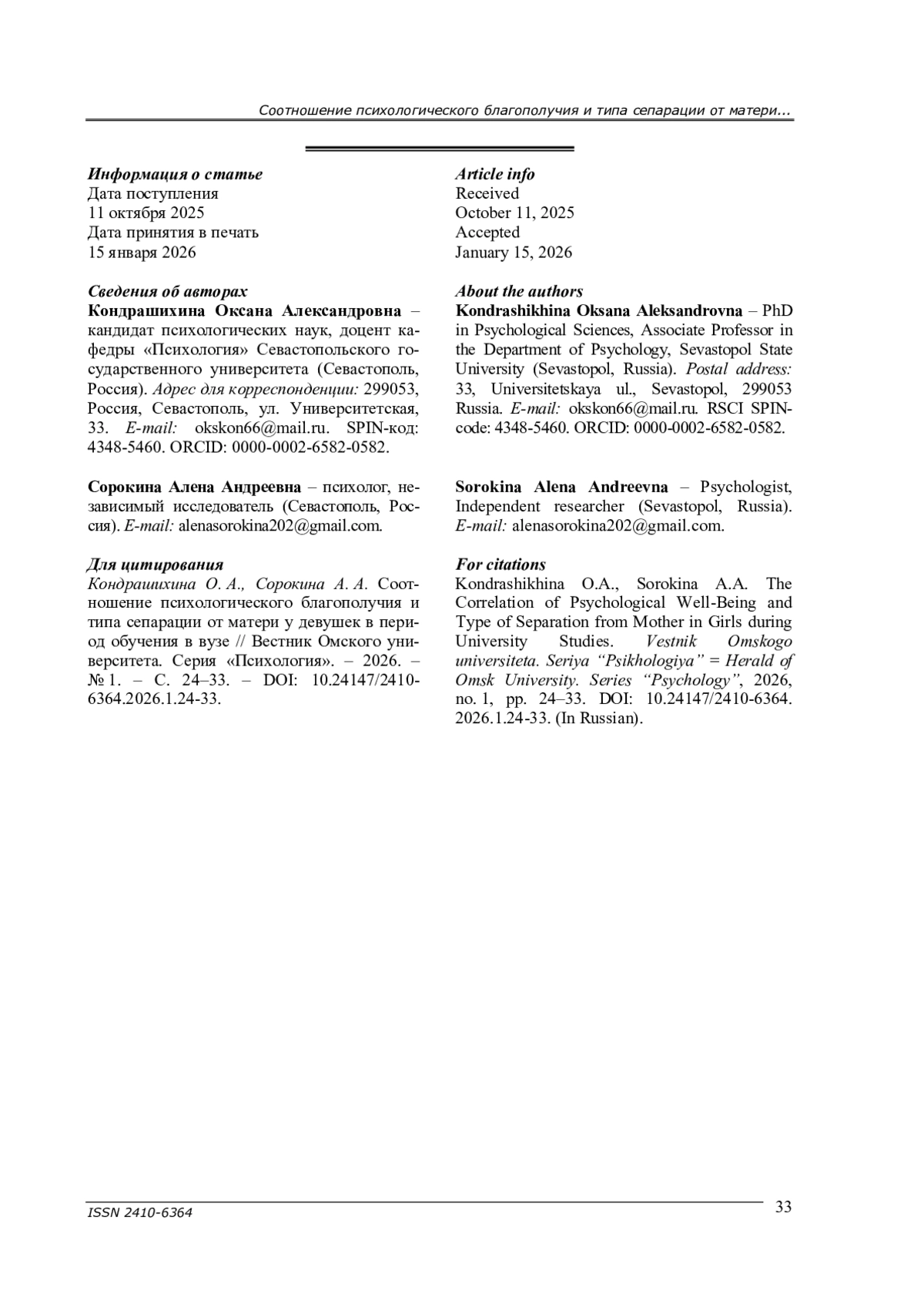 11. Харитонова А. А. Исследование сепарационной тревоги студентов в связи с их социально-психологическими характеристиками // Северо-Кавказский психологический вестник. - 2022. - Т. 20, № 3. - С. 62-74. -. DOI: 10.21702/ncpb.2022.3.5