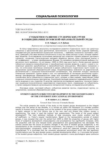 В статье представлены результаты исследования развития студенческих групп как целостных субъектов в трансспективе двух десятилетий, выполненного в рамках более широкой проблемы, специфичной для отечественной социальной психологии, - проблемы психологии группового субъекта, имеющей в XXI веке высокую актуальность в силу тех новых рисков и угроз, которые переживает общество. В исследовании использован авторский тест-опросник «Уровни развития группового субъекта», основными статистическими методами обработки данных стали кластерный анализ и φ*-коэффициент - угловое преобразование Фишера. На материале репрезентативной выборки студенческих групп выявлено, что за период с 2005 по 2024 годы доля групп с более высоким уровнем субъектного развития (мезосубъектным и просубъектным) значимо возросла, а доля с низким и пониженным уровнями (досубъектным и квазисубъектным) уменьшилась. Обосновано положение о том, что источником позитивных изменений в уровне субъектности студенческих групп служит социодинамика вузовской образовательной среды. Охарактеризованы изменения ее дидактической, воспитательной и социально-психологической составляющих, под влиянием которых произошли отмеченные изменения. Сделан вывод о том, что претерпевшая за последнее десятилетие существенные трансформации образовательная среда вуза вызывает удвоенный развивающий эффект: способствует росту субъектности студенческих групп, которые, в свою очередь, представляют собой социально-психологическое пространство, благоприятствующее развитию индивидуальной субъектности входящих в них студентов. В качестве перспектив исследования выделены: изучение отдельных социально-психологических характеристик студенческих групп, отражающих их субъектность, а также совершенствование организационно-методической стороны исследовательской работы.