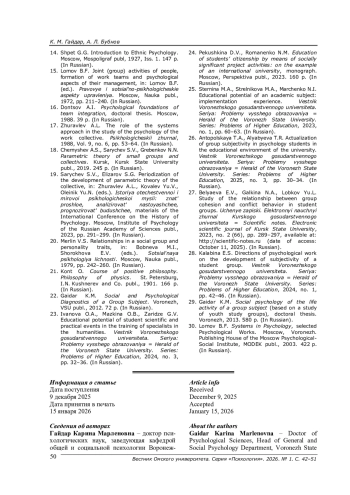 28. Калабина Е. С. Направления психологической работы по развитию субъектности студенческой группы // Вестник Воронежского государственного университета. Серия: Проблемы высшего образования. - 2024. - № 1. - С. 42-46.