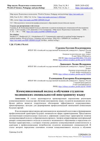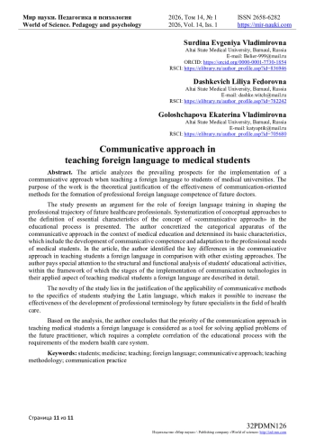 В исследовании представлена аргументация роли иноязычной подготовки в формировании профессиональной траектории будущих специалистов сферы здравоохранения. Представлена систематизация концептуальных подходов к дефиниции сущностных характеристик понятия «коммуникативный подход» в образовательном процессе. Автором конкретизирован категориальный аппарат коммуникативного подхода в контексте медицинского образования и определены его базовые характеристики, к которым отнесены развитие коммуникативной компетентности и адаптация к профессиональным потребностям студентов медицинских специальностей. В статье автором определены ключевым отличия коммуникативного подхода в обучении студентов иностранному языку в сравнении с иными существующими подходами. Особое внимание автором уделено структурно-функциональному анализу учебной деятельности студентов, в рамках которого детально описаны этапы реализации коммуникативных технологий в их прикладном аспекте обучения студентов-медиков иностранному языку.