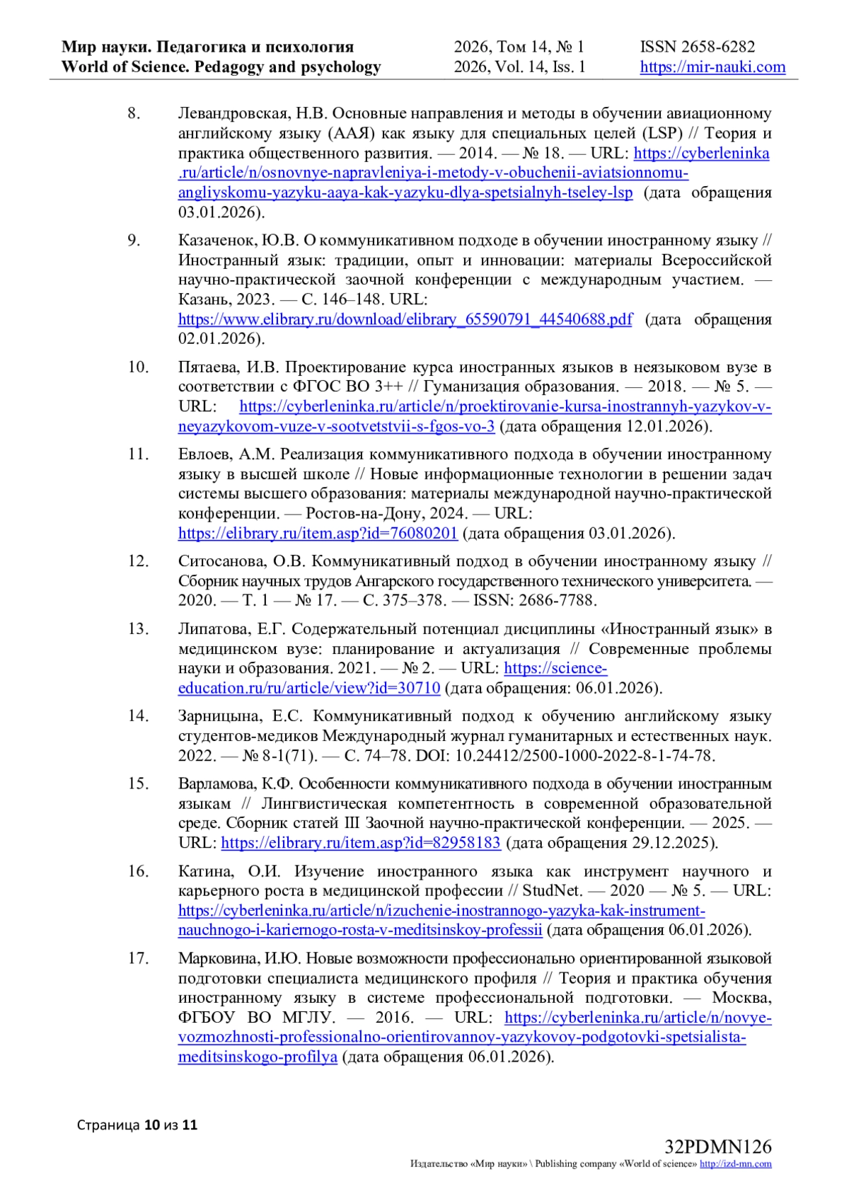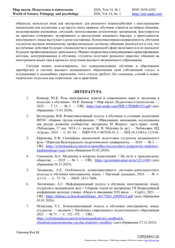 1. Кижнер, Ю.К. Роль иностранных языков в современном мире и эволюция в подходах к обучению / Ю.К. Кижнер // Мир науки. Педагогика и психология. — 2025. — Т 13. — № 5. — URL: https://mir-nauki.com/PDF/17PDMN525.pdf (дата обращения: 13.01.2026).