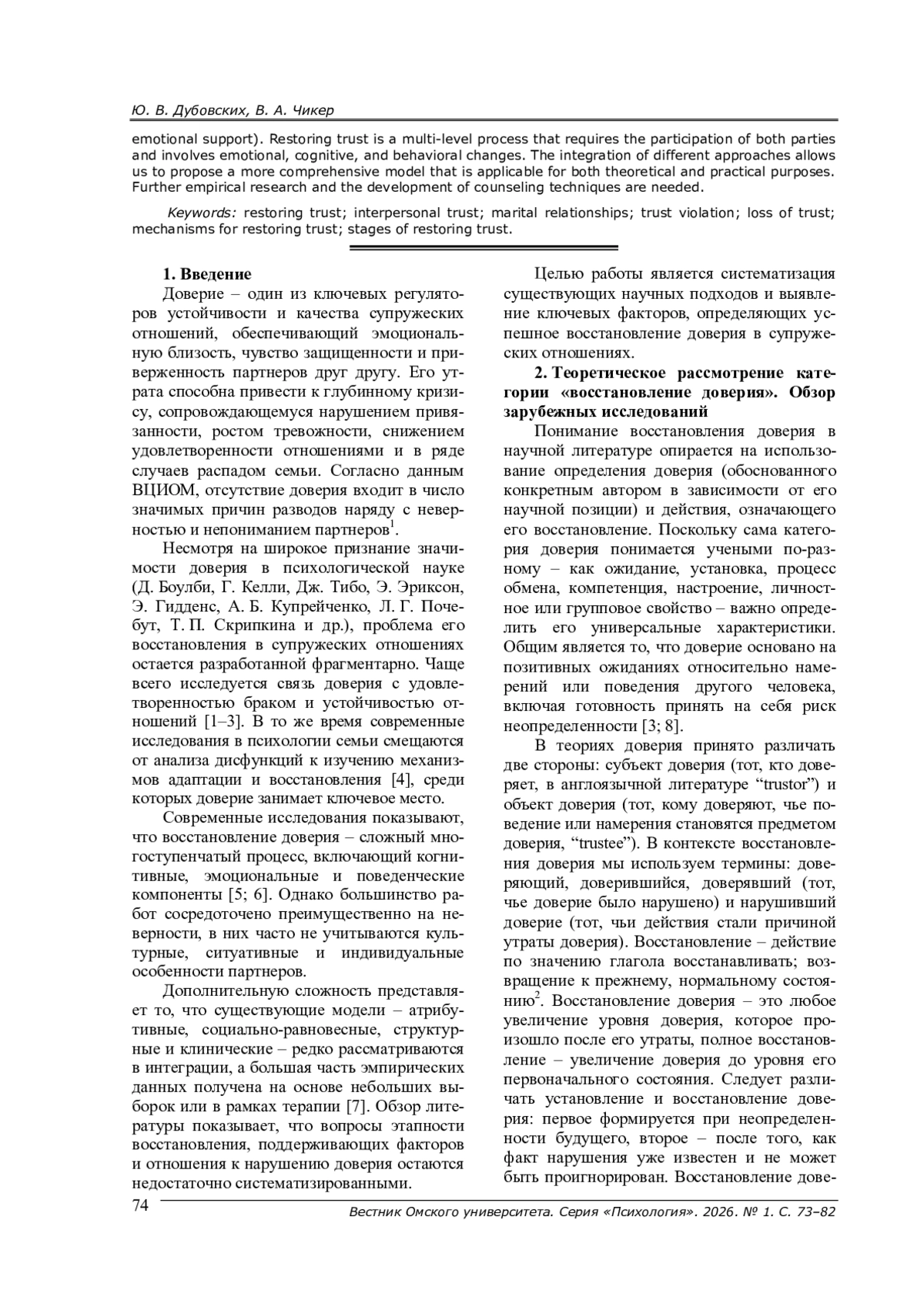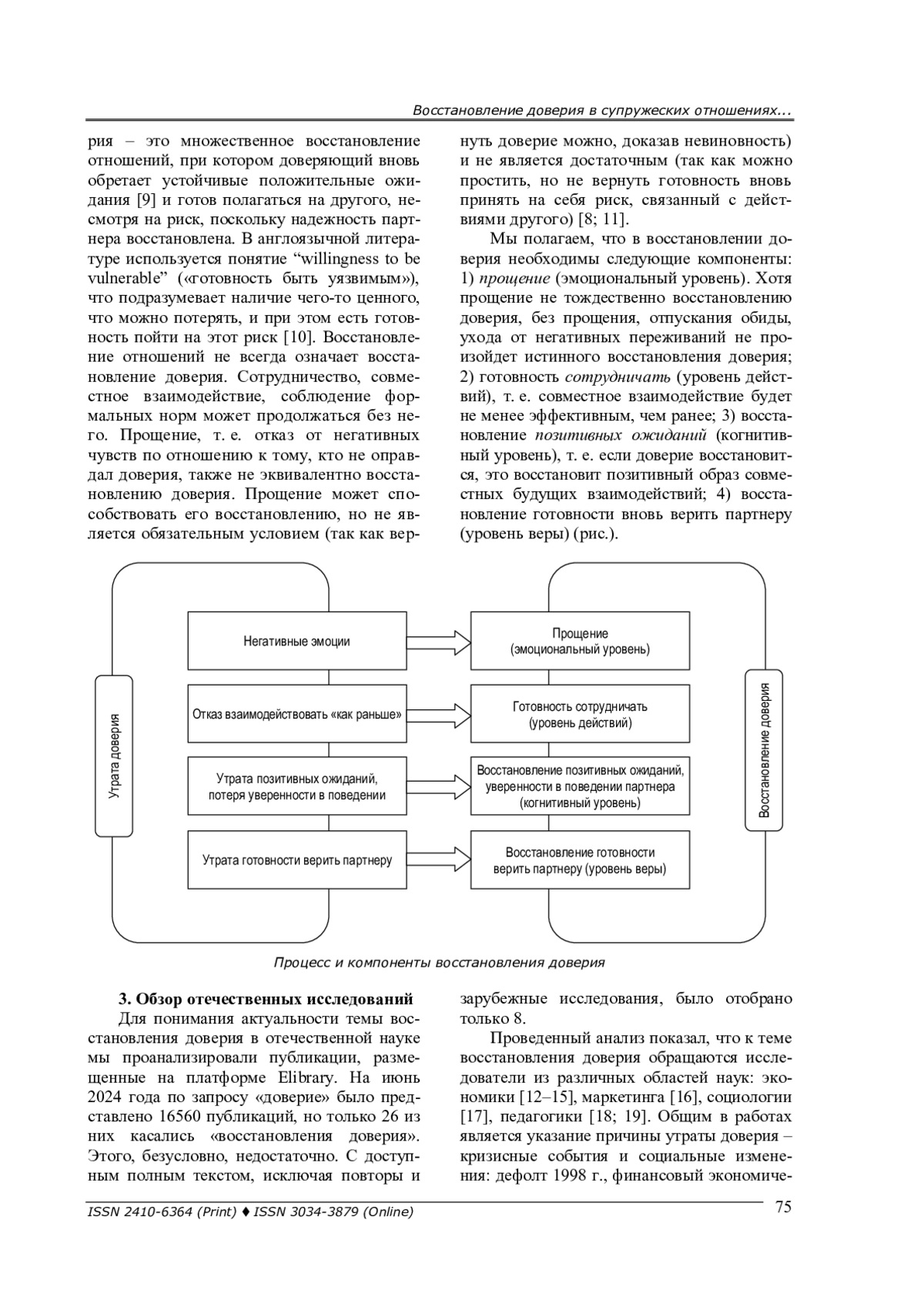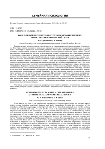 Доверие играет ключевую роль в устойчивости и удовлетворенности супружескими отношениями. Его утрата может привести к серьезным кризисам, включая эмоциональное отдаление и распад семьи. Несмотря на признание значимости доверия в психологии, его восстановление после утраты, особенно в супружеском контексте, остается недостаточно изученной областью. Цель работы - систематизировать теоретические подходы и эмпирические данные, касающиеся восстановления доверия в супружеских отношениях, и выявить ключевые факторы, способствующие этому процессу. Анализируются три ключевых подхода: атрибутивный, на основе восприятия причин поступка; подход социального баланса, опирающийся на восстановление норм взаимодействия; структурный подход, учитывающий влияние внешних изменений и норм. Также рассматриваются практико-ориентированные подходы парной терапии (эмоционально-фокусированная, когнитивно-поведенческая и др.). На основании анализа различных психологических подходов предложена интегративная модель восстановления доверия. Выделены четыре ключевых компонента восстановления доверия: прощение, готовность к сотрудничеству, восстановление позитивных ожиданий, готовность вновь верить партнеру. Описаны этапы процесса восстановления: эмоциональное реагирование, осмысление произошедшего, изменение поведения, переоценка отношений. Показано, что восстановление доверия возможно не только после измены, но и в контексте других нарушений (финансовое поведение, границы и конфиденциальность, эмоциональная поддержка). Восстановление доверия - это многоуровневый процесс, требующий участия обеих сторон и включающий эмоциональные, когнитивные и поведенческие изменения. Интеграция разных подходов позволяет предложить более полную модель, применимую как в теоретических, так и практических целях. Необходимы дальнейшие эмпирические исследования и развитие консультативных методик.