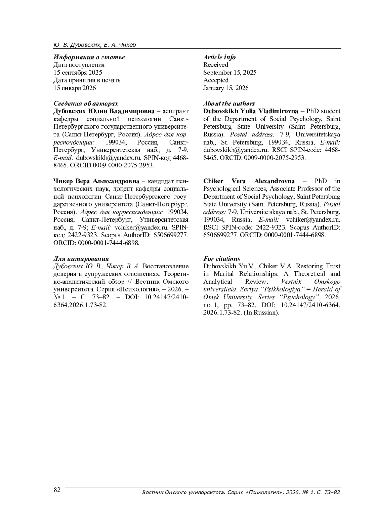 3. Дубовских Ю. В., Почебут Л. Г., Чикер В. А. Взаимосвязь доверия с удовлетворенностью семейными отношениями // Институт психологии Российской академии наук. Социальная и экономическая психология. - 2024. - Т. 9, № 1 (33). - С. 125-147. -. DOI: 10.38098/ipran.sep_2024_33_1_06
