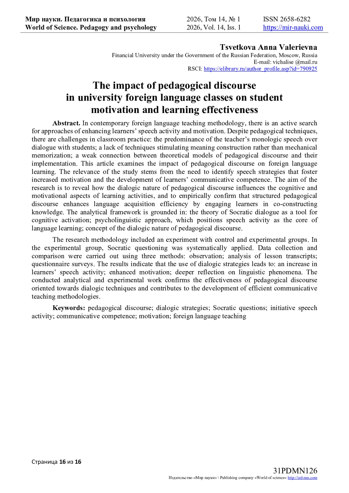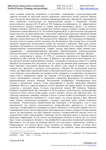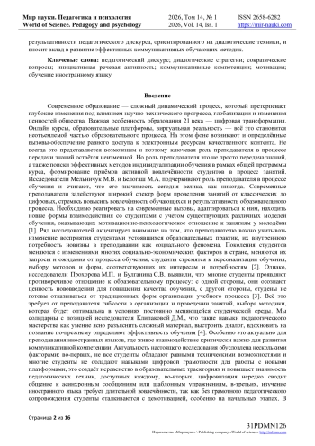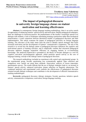 Цель исследования — выявить, как диалогическая природа педагогического дискурса влияет на когнитивные и мотивационные аспекты учебной деятельности, эмпирически подтвердить, что структурированный педагогический дискурс повышает эффективность усвоения языка за счёт вовлечения обучающихся в совместное конструирование знаний. Основу анализа определили теория сократического диалога как инструмента когнитивной активизации, психолингвистический подход о речевой деятельности как ядре языкового обучения, а также концепция о диалогичности педагогического дискурса. Методология исследования включала педагогический эксперимент с контрольной и экспериментальной группами. В экспериментальной группе систематически применялись сократические вопросы. Сбор и сравнение данных осуществлялись тремя взаимодополняющими методами: наблюдение, анализ аудиозаписей занятий, анкетирование.