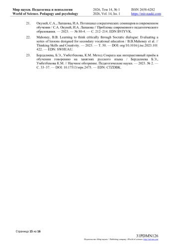 22. Mahoney, B.B. Learning to think critically through Socratic dialogue: Evaluating a series of lessons designed for secondary vocational education / B.B.Mahoney et al. // Thinking Skills and Creativity. — 2023. — Т. 50. — DOI: org/10.1016/j.tsc.2023.101 422. — EDN: SWHUAU.