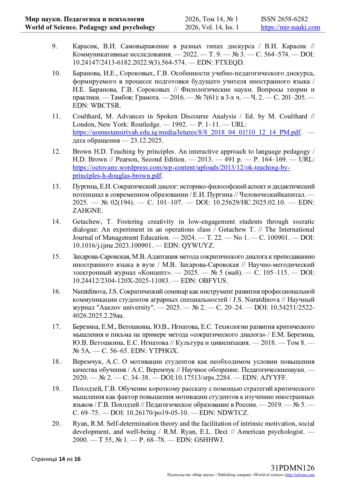 15. Захарова-Саровская, М.В. Адаптация метода сократического диалога к преподаванию иностранного языка в вузе / М.В. Захарова-Саровская // Научно-методический электронный журнал «Концепт». — 2025. — № 5 (май). — С. 105–115. — DOI: 10.24412/2304-120X-2025-11083. — EDN: OBFYUS.