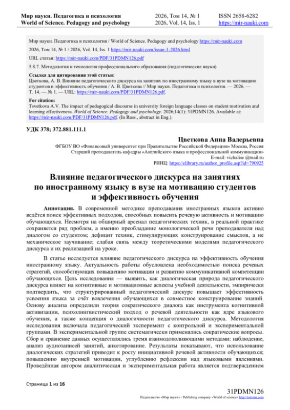 В статье исследуется влияние педагогического дискурса на эффективность обучения иностранному языку. Актуальность работы обусловлена необходимостью поиска речевых стратегий, способствующих повышению мотивации и развитию коммуникативной компетенции обучающихся.