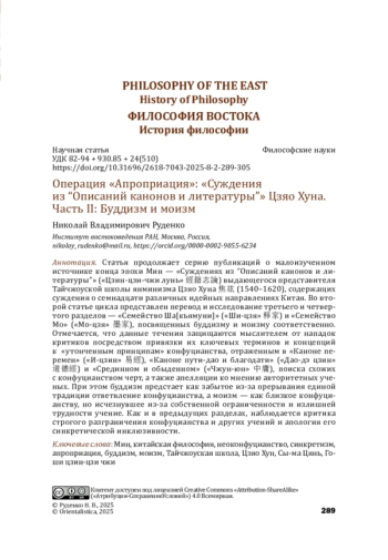 Статья продолжает серию публикаций о малоизученном источнике конца эпохи Мин — «Суждениях из “Описаний канонов и литературы”» («Цзин-цзи-чжи лунь» 經籍志論) выдающегося представителя Тайчжоуской школы янминизма Цзяо Хуна 焦竑 (1540–1620), содержащих суждения о семнадцати различных идейных направлениях Китая. Во второй статье цикла представлен перевод и исследование третьего и четвертого разделов — «Семейство Ша[кьямуни]» («Ши-цзя» 释家) и «Семейство Мо» («Мо-цзя» 墨家), посвященных буддизму и моизму соответственно. Отмечается, что данные течения защищаются мыслителем от нападок критиков посредством привязки их ключевых терминов и концепций к «утонченным принципам» конфуцианства, отраженным в «Каноне перемен» («И-цзин» 易經), «Каноне пути-дао и благодати» («Дао-дэ цзин» 道德經) и «Срединном и обыденном» («Чжун-юн» 中庸), поиска схожих с конфуцианством черт, а также апелляции ко мнению авторитетных ученых. При этом буддизм предстает как забытое из-за прерывания единой традиции ответвление конфуцианства, а моизм — как близкое конфуцианству, но исчезнувшее из-за собственной ограниченности и излишней трудности учение. Как и в предыдущих разделах, наблюдается критика строгого разграничения конфуцианства и других учений и апология его синкретической инклюзивности.