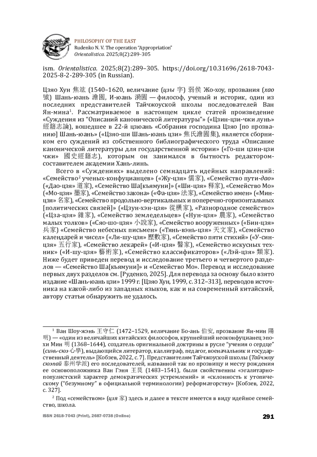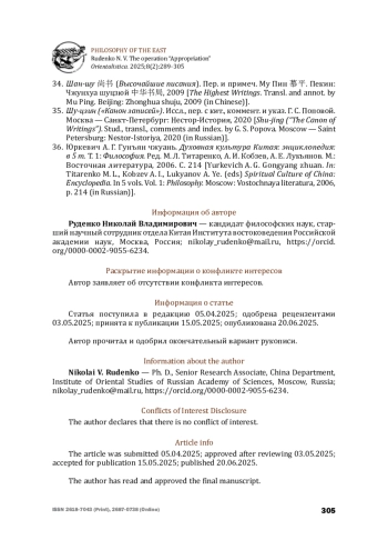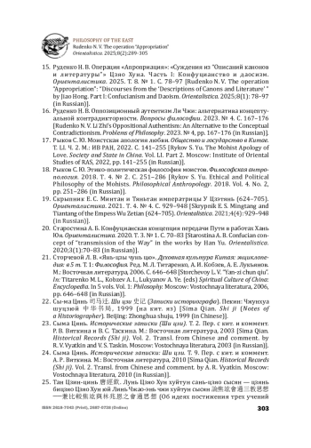 15. Руденко Н. В. Операция “Апроприация”: “Суждения из “Описаний канонов и литературы” Цзяо Хуна. Часть I: Конфуцианство и даосизм. Ориенталистика. 2025. Т. 8. № 1. С. 78-97 [Rudenko N. V. The operation “Appropriation”: “Discourses from the ‘Descriptions of Canons and Literature’ “ by Jiao Hong. Part I: Confucianism and Daoism. Orientalistica. 2025;8(1): 78-97 (in Russian)].