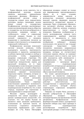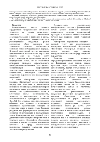 В данной статье на основе материалов книги «Биографии образцовых женщин» ЛюСянь времен династии Хань исследуется роль конфуцианской мысли в создании женских культурных символов и её влияние на гендерные и властные структуры. В статье анализируется, как биографии образцовых женщин формируют моральный образ женщины Китая, способствуют поддержанию семейной этики и социальной стабильности, а также рассматриваются механизмы подавления женской субъектности в данной книге. Опираясь на теорию власти Фуко и культурную критику феминизма, автор раскрывает, как женские моральные стандарты через процесс дисциплинирования становятся важным инструментом власти. В статье подчеркивается, что через восхваление таких качеств, как верность и нравственная строгость, конфуцианская культура не только усиливает патриархальную систему, но и скрывает ограниченное положение женщин в гендерных нормах и социальных ожиданиях. Автор также предлагает возможное переосмысление традиционных женских добродетелей, призывая к разрыву гендерных ярлыков и созданию более свободного пространства для субъектности современных женщин.