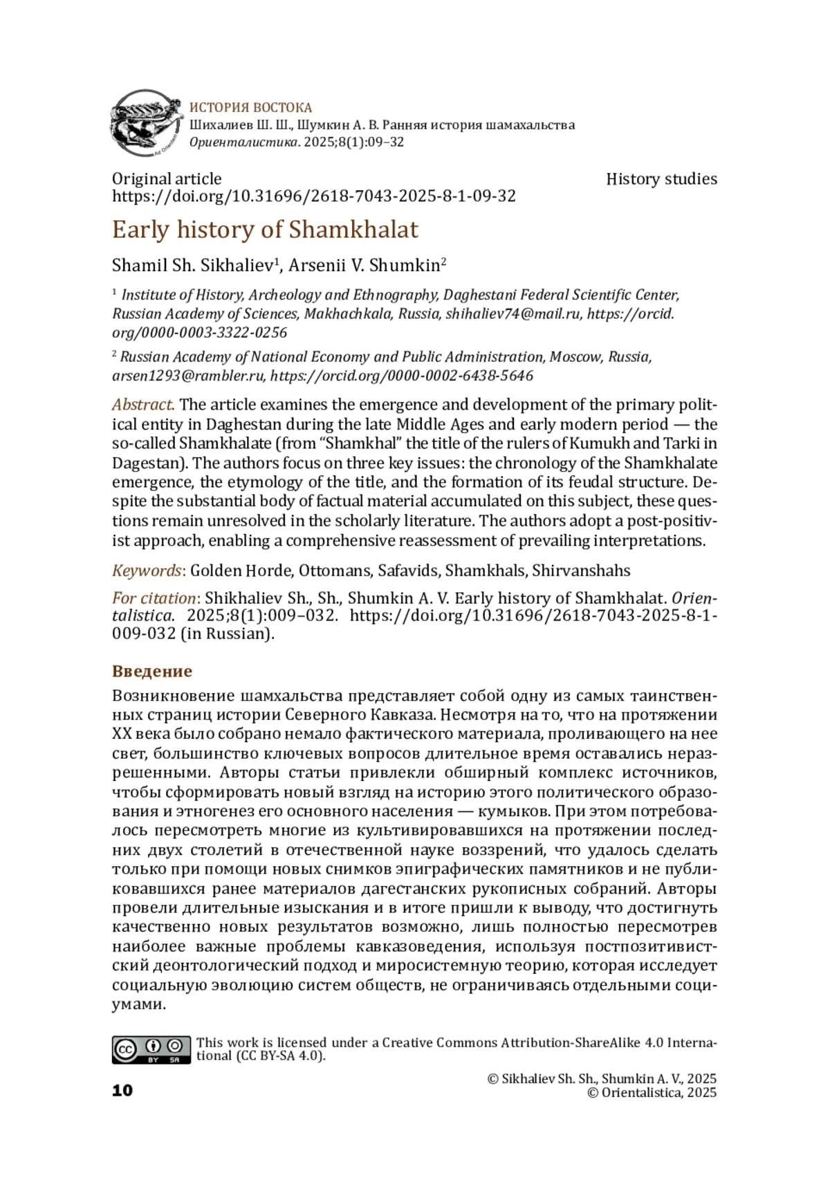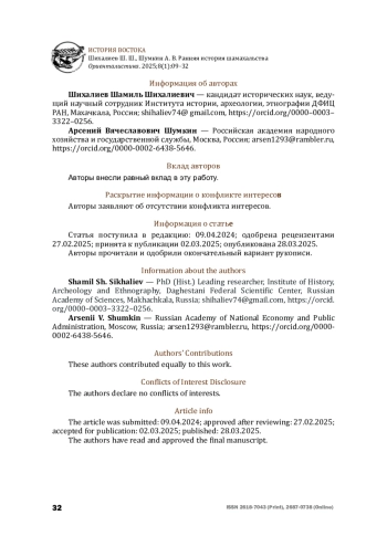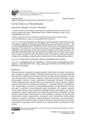 Возникновение шамхальства представляет собой одну из самых таинственных страниц истории Северного Кавказа. Несмотря на то, что на протяжении XX века было собрано немало фактического материала, проливающего на нее свет, большинство ключевых вопросов длительное время оставались неразрешенными. Авторы статьи привлекли обширный комплекс источников, чтобы сформировать новый взгляд на историю этого политического образования и этногенез его основного населения — кумыков. При этом потребовалось пересмотреть многие из культивировавшихся на протяжении последних двух столетий в отечественной науке воззрений, что удалось сделать только при помощи новых снимков эпиграфических памятников и не публиковавшихся ранее материалов дагестанских рукописных собраний. Авторы провели длительные изыскания и в итоге пришли к выводу, что достигнуть качественно новых результатов возможно, лишь полностью пересмотрев наиболее важные проблемы кавказоведения, используя постпозитивистский деонтологический подход и миросистемную теорию, которая исследует социальную эволюцию систем обществ, не ограничиваясь отдельными социумами.