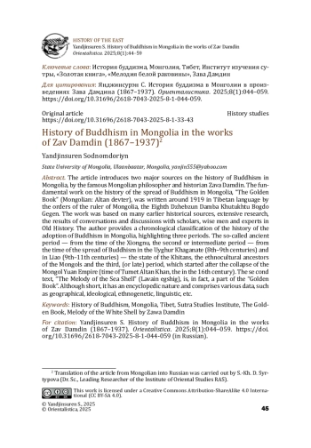 В данной статье представлены два крупных источника по истории буддизма в Монголии, автором которых является известный монгольский философ и историк Зава Дамдин (1867–1937). “Золотая книга” (монг. Алтан дэвтэр), фундаментальный труд по истории распространения буддизма в Монголии, был написан на тибетском языке по поручению правителя Монголии Джебзун-Дамба-хутухты Богдо-гэгэна Восьмого предположительно в 1919 г. Работа базируется на множестве более ранних исторических источников, огромной исследовательской работе, результатах бесед и дискуссий с учеными, интервью с мудрецами своего времени, знатоками старины. Автор дает хронологическую классификацию истории принятия буддизма на территории Монголии, выделяя три периода: древний — со времен хунну, второй, или промежуточный, — со времен распространения буддизма в Уйгурском каганате (VIII–IX вв.) и в Ляо (IX–XI вв.) — государстве киданей, этнокультурных предков монголов. И третий, или поздний, период распространения буддизма приходится ко времени после крушения монгольской империи Юань, уже благодаря деятельности Алтан-Хана Тумэтского в XVI в., когда монгольская военная поддержка содействовала росту и доминанте школы гелукпа в Тибете, а затем и в Монголии. Второй текст — “Мелодия морской раковины” (Лавайн эгшиг), является, по сути, частью “Золотой книги”, особенность его состоит в краткости и энциклопедичности содержания, где представлены географические, мировоззренческие, этногенетические, лингвистические и прочие данные.
