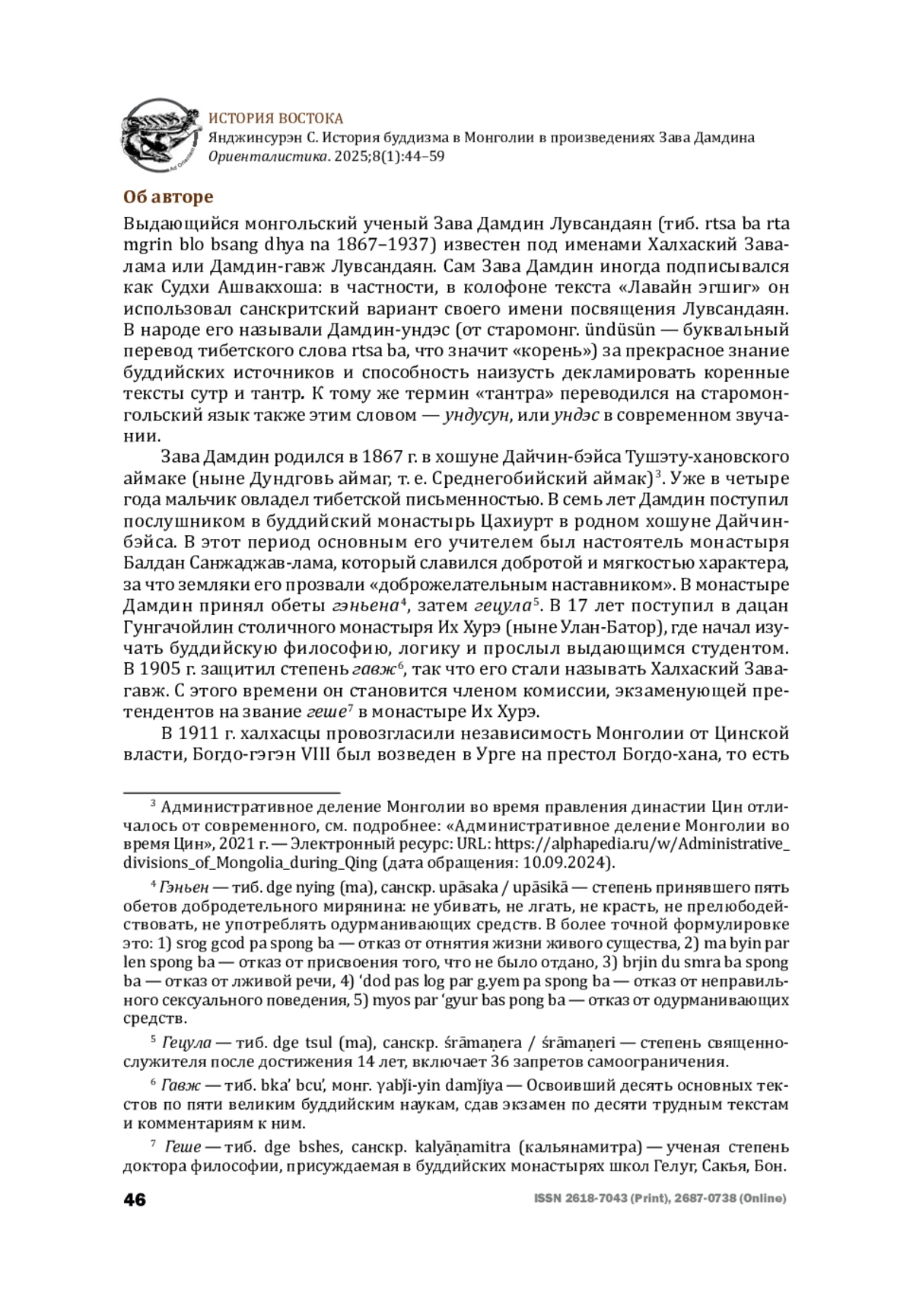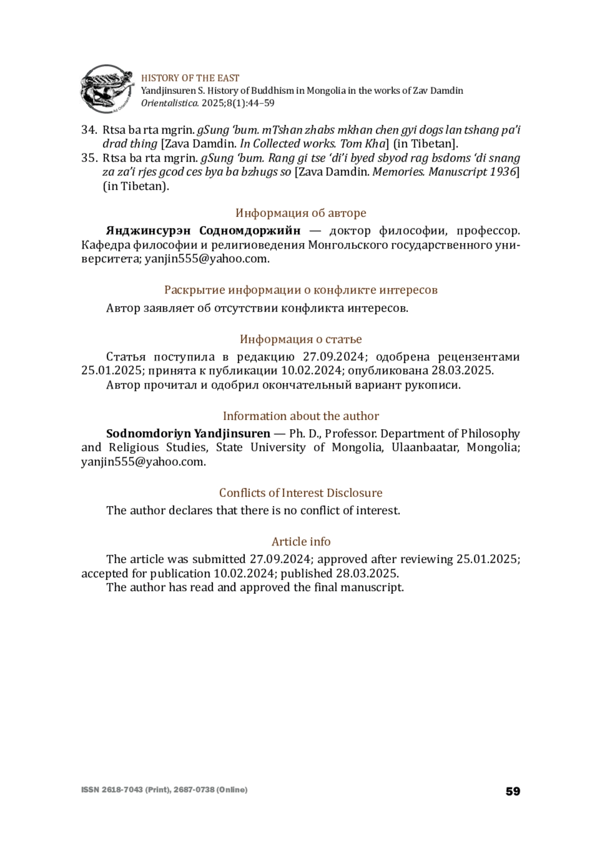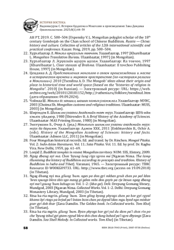 6. Ванчикова Ц. П., Жабон Ю. Ж. Сочинение дорамба Гэлэгжамцо по истории буддизма в Бурятии как уникальный памятник жанра чойнчжун. Культура Центральной Азии: письменные источники. 2018. Вып. 11. Ч. 2. С. 72-87 [Vanchikova Ts. P., Zhabon Yu. Zh. The composition of the doramba Gelegzhamtso on the history of Buddhism in Buryatia as a unique monument of the choinzhun genre. Culture of Central Asia: written sources. 2018. Issue 11. Part, pp. 72-87) (in Russian).