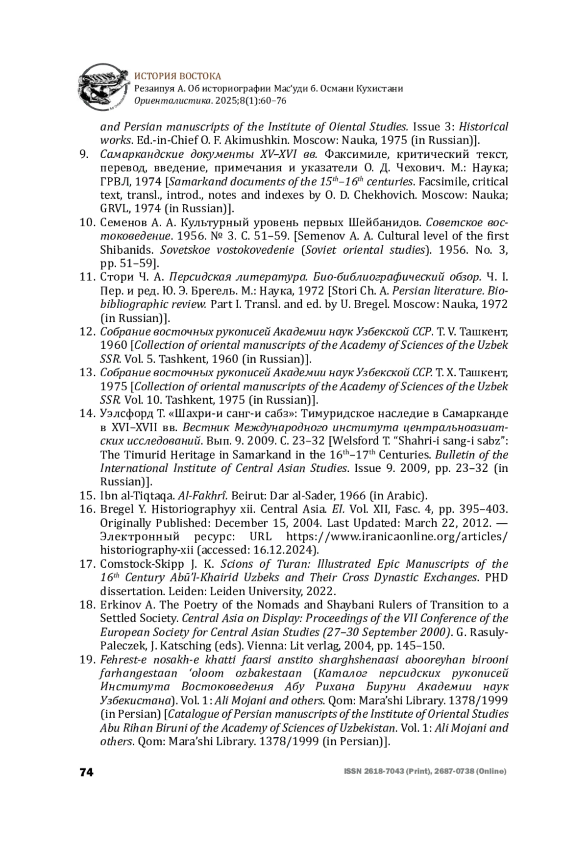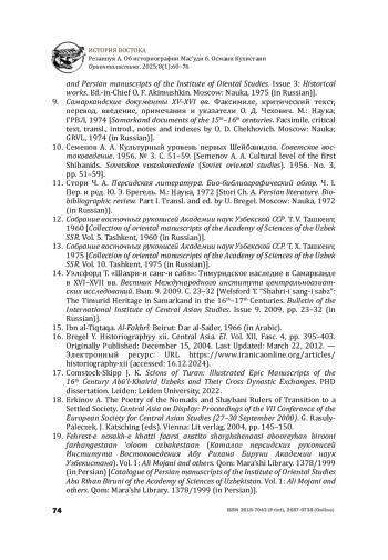 21. Собрание восточных рукописей Академии наук Узбекской ССР. Т. X. Ташкент, 1975 [Collection of oriental manuscripts of the Academy of Sciences of the Uzbek SSR. Vol. 10. Tashkent, 1975 (in Russian)].