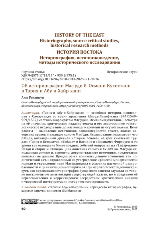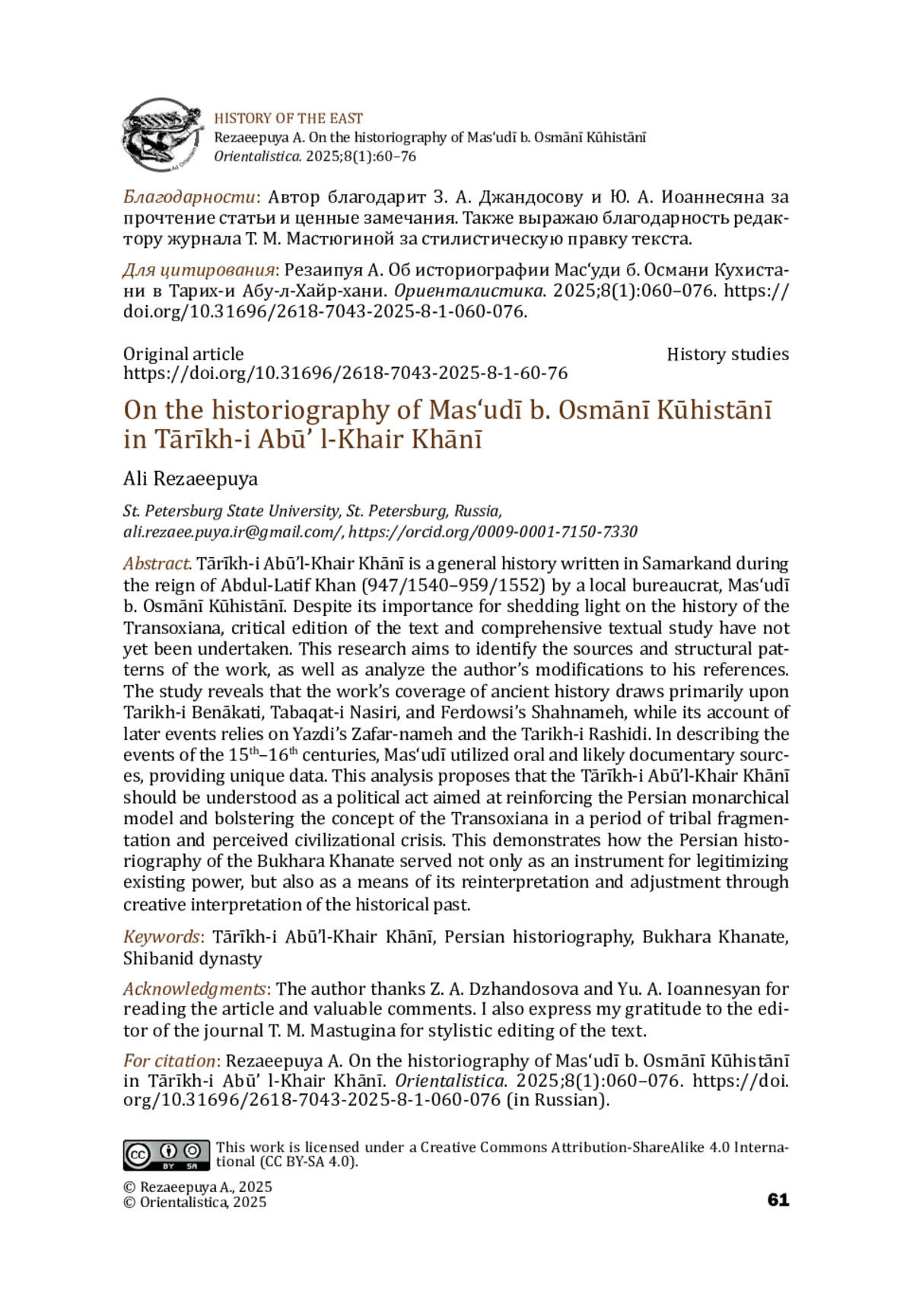 «Тарих-и Абу-л-Хайр-хани» — всеобщая история, написанная в Самарканде во время правления Абд-ул-Латиф-хана (947/1540– 959/1552) местным бюрократом Mac‘уди б. Османом Кухистани. Несмотря на её значение, критическое издание текста и его всестороннее текстологическое исследование до настоящего времени не осуществлены. Цель работы — выявление источников, закономерностей текста, анализ авторских правок и взглядов самого Mac‘уди. Исследование показывает, что раздел, посвященный древней истории, основан на трех ключевых трудах: «Тарих-и Бенакати», «Табакат-и Насири» и «Шахнаме» Фирдоуси, в то время как освещение более поздних событий опирается на «Зафар-наме» Йазди и «Тарих-и Рашиди». Для описания событий XV–XVI вв. Mac‘уди использовал устные и, вероятно, документальные источники, предоставив уникальные данные. Предлагается понимать данное сочинение как политический акт, направленный на утверждение иранской монархической модели и укрепление идеи Мавераннахра в условиях племенной раздробленности и цивилизационного кризиса. Пример этого текста демонстрирует, как персидская историография Бухарского ханства служила не только инструментом легитимации существующей власти, но и средством её переосмысления и корректировки посредством критического анализа и творческой интерпретации исторического прошлого.