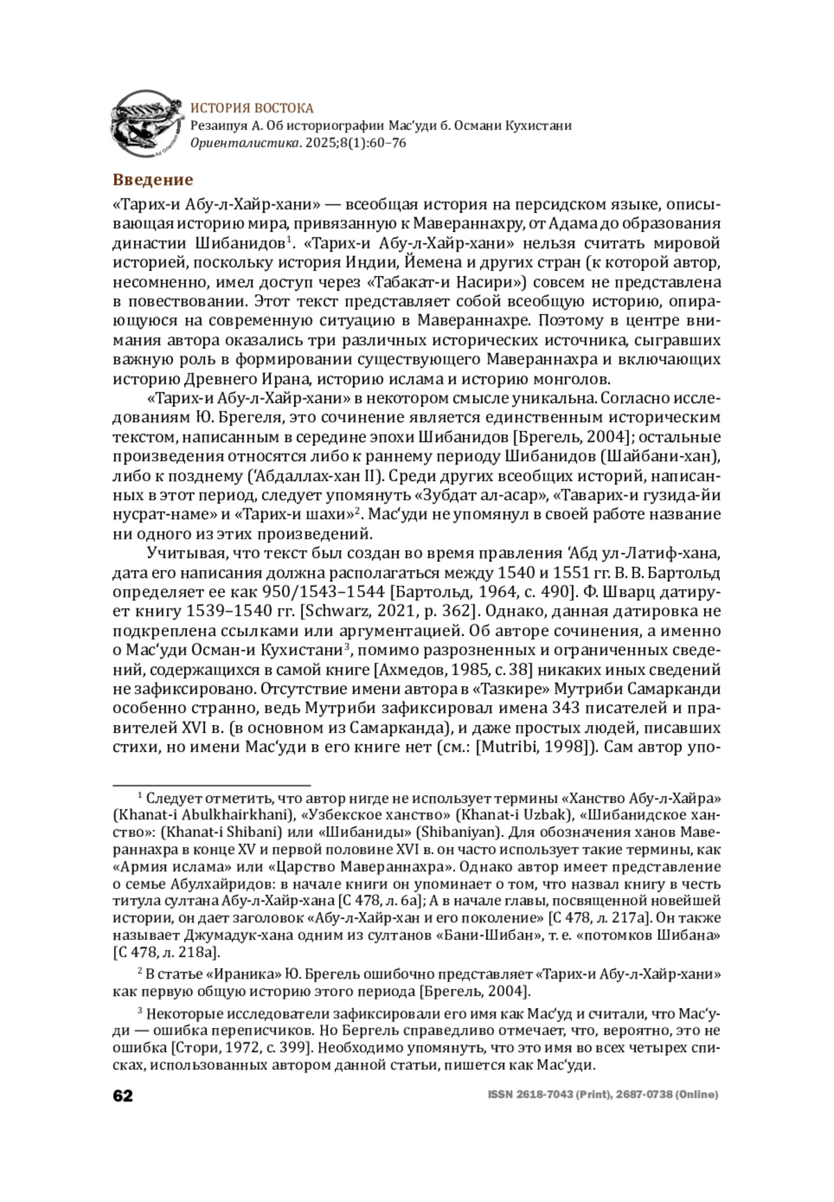 24. Bregel Y. Historiographyy xii. Central Asia. EI. Vol. XII, Fasc. 4, pp. 395-403. Originally Published: December 15, 2004. Last Updated: March 22, 2012. - Электронный ресурс: URL https://www.iranicaonline.org/articles/historiography-xii.