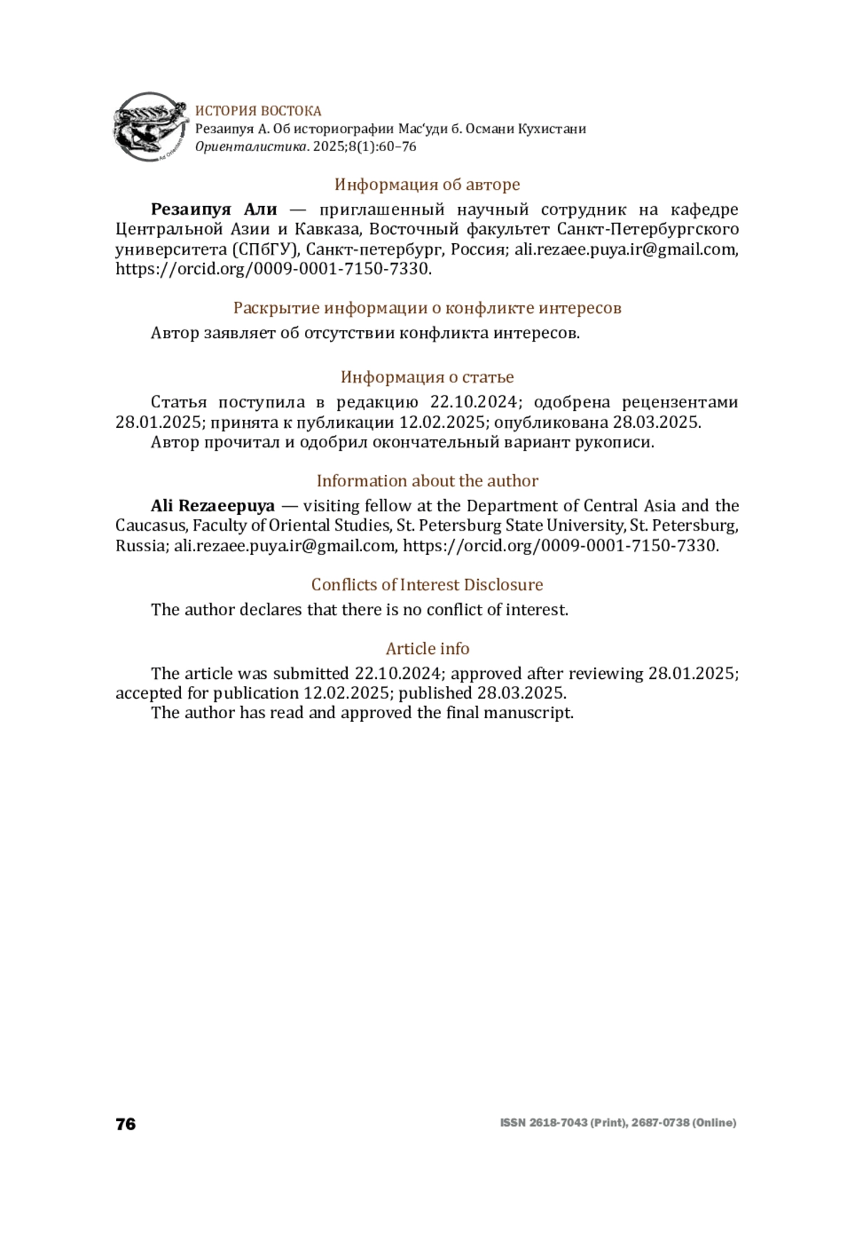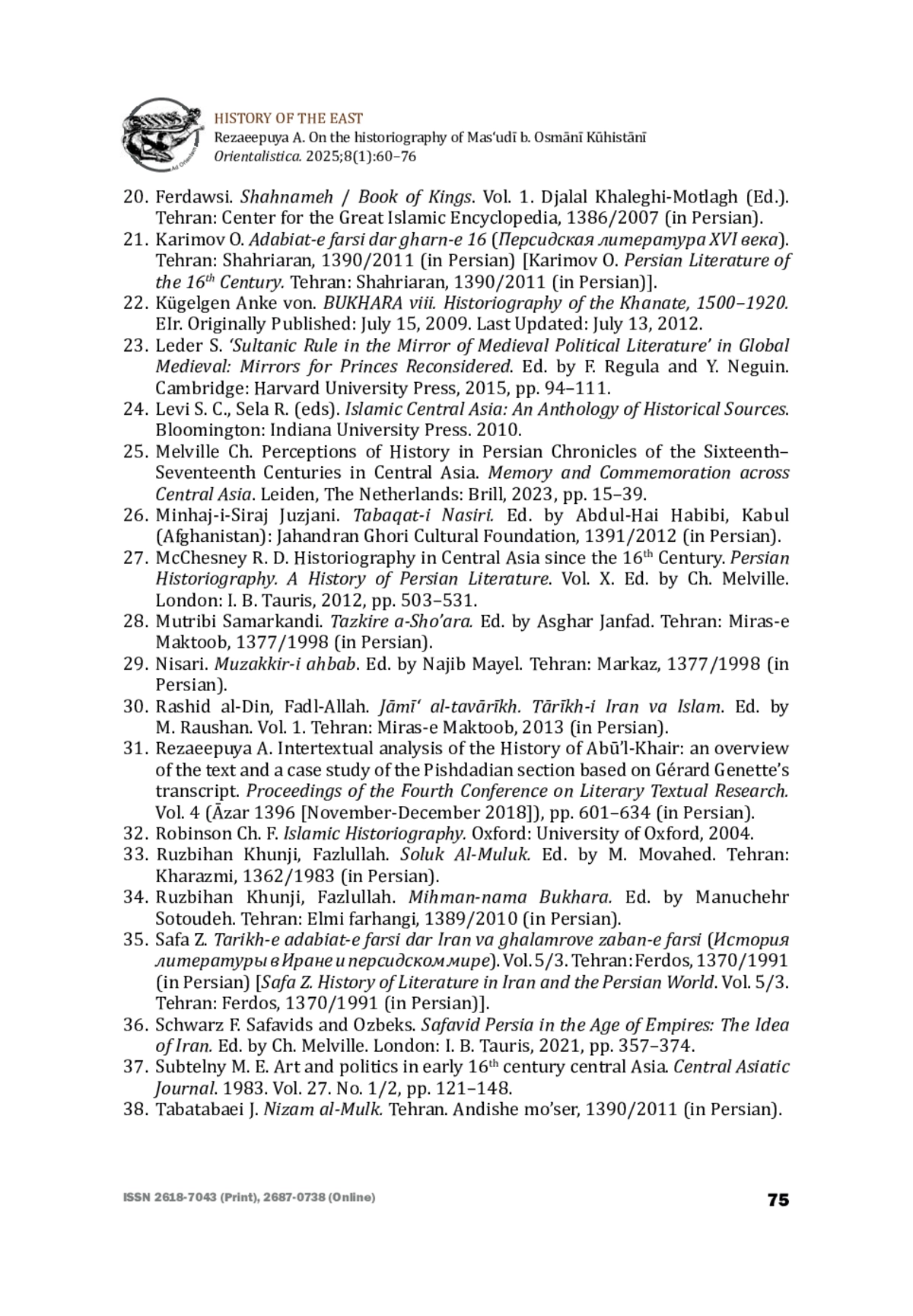 33. Melville Ch. Perceptions of History in Persian Chronicles of the Sixteenth-Seventeenth Centuries in Central Asia. Memory and Commemoration across Central Asia. Leiden, The Netherlands: Brill, 2023, pp. 15-39.
