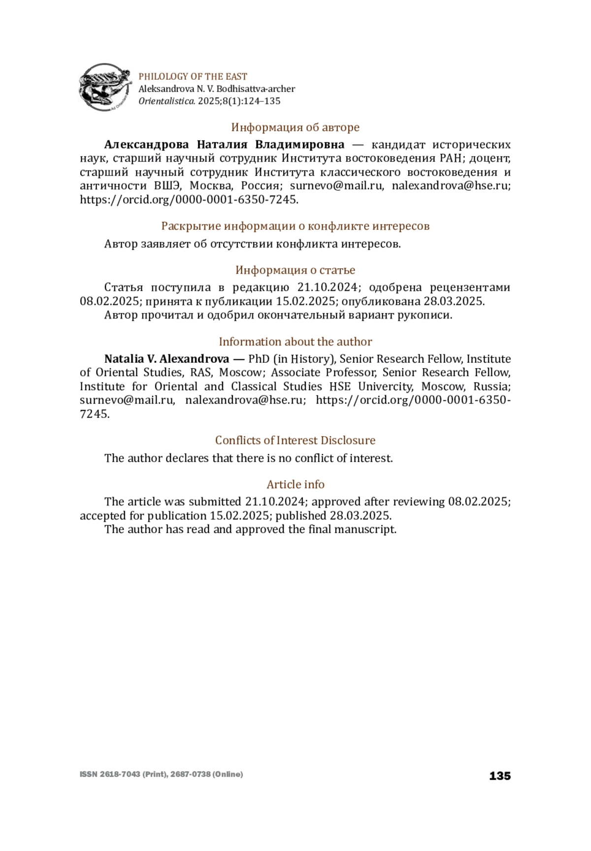 1. Александрова Н. В. Путь и текст. Китайские паломники в Индии. М.:Восточная литература, 2008. [Aleksandrova N. V. The Path and the Text: Chinese Pilgrims in India. Moscow: Vostochnaya literatura, 2008 (in Russian)].