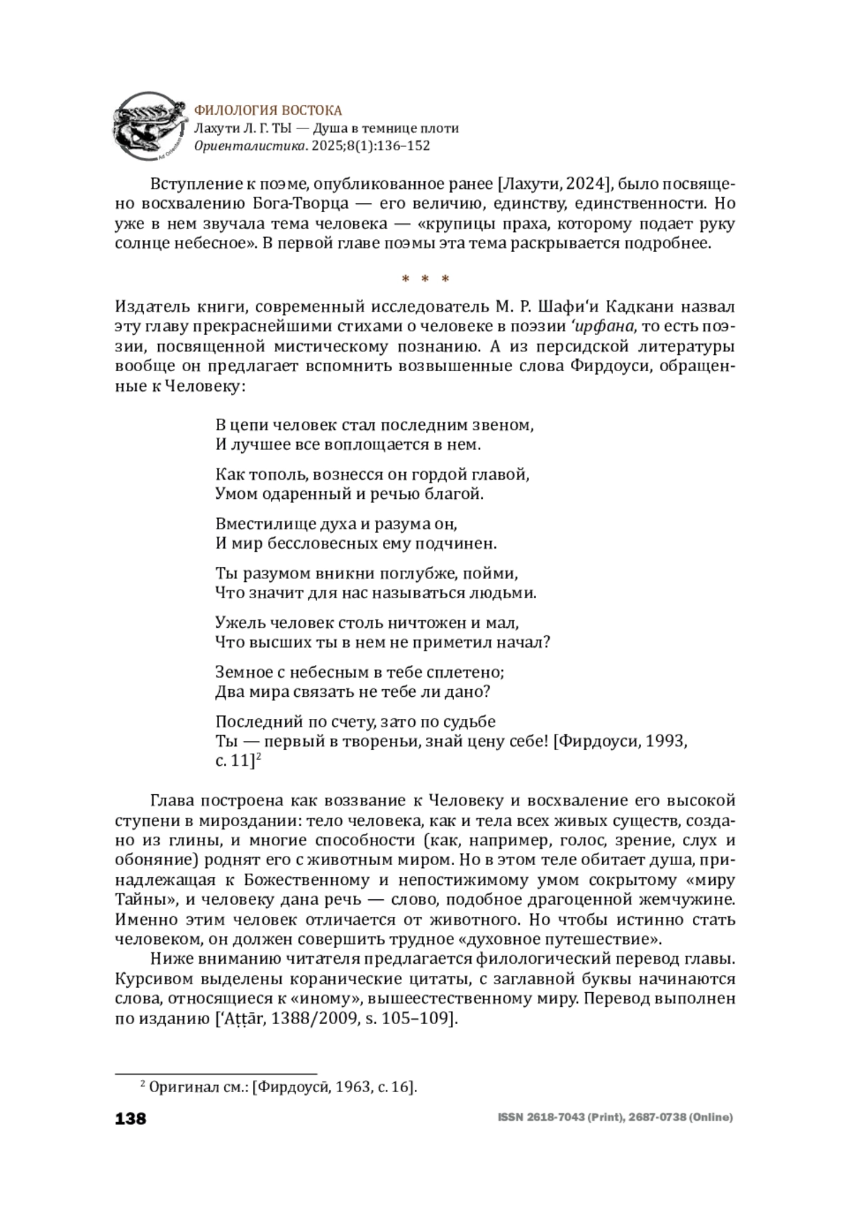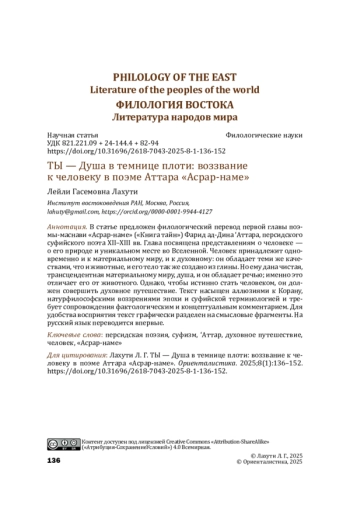 В статье предложен филологический перевод первой главы поэмы-маснави «Асрар-наме» («Книга тайн») Фарид ад-Дина ʻАттара, персидского суфийского поэта XII–XIII вв. Глава посвящена представлениям о человеке — о его природе и уникальном месте во Вселенной. Человек принадлежит одновременно и к материальному миру, и к духовному: он обладает теми же качествами, что и животные, и его тело так же создано из глины. Но ему дана чистая, трансцендентная материальному миру, душа, и он обладает речью; именно это отличает его от животного. Однако, чтобы истинно стать человеком, он должен совершить духовное путешествие. Текст насыщен аллюзиями к Корану, натурфилософскими воззрениями эпохи и суфийской терминологией и требует сопровождения фактологическим и концептуальным комментарием. Для удобства восприятия текст графически разделен на смысловые фрагменты. На русский язык переводится впервые.