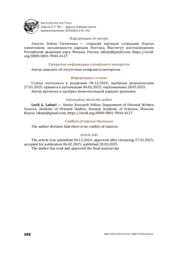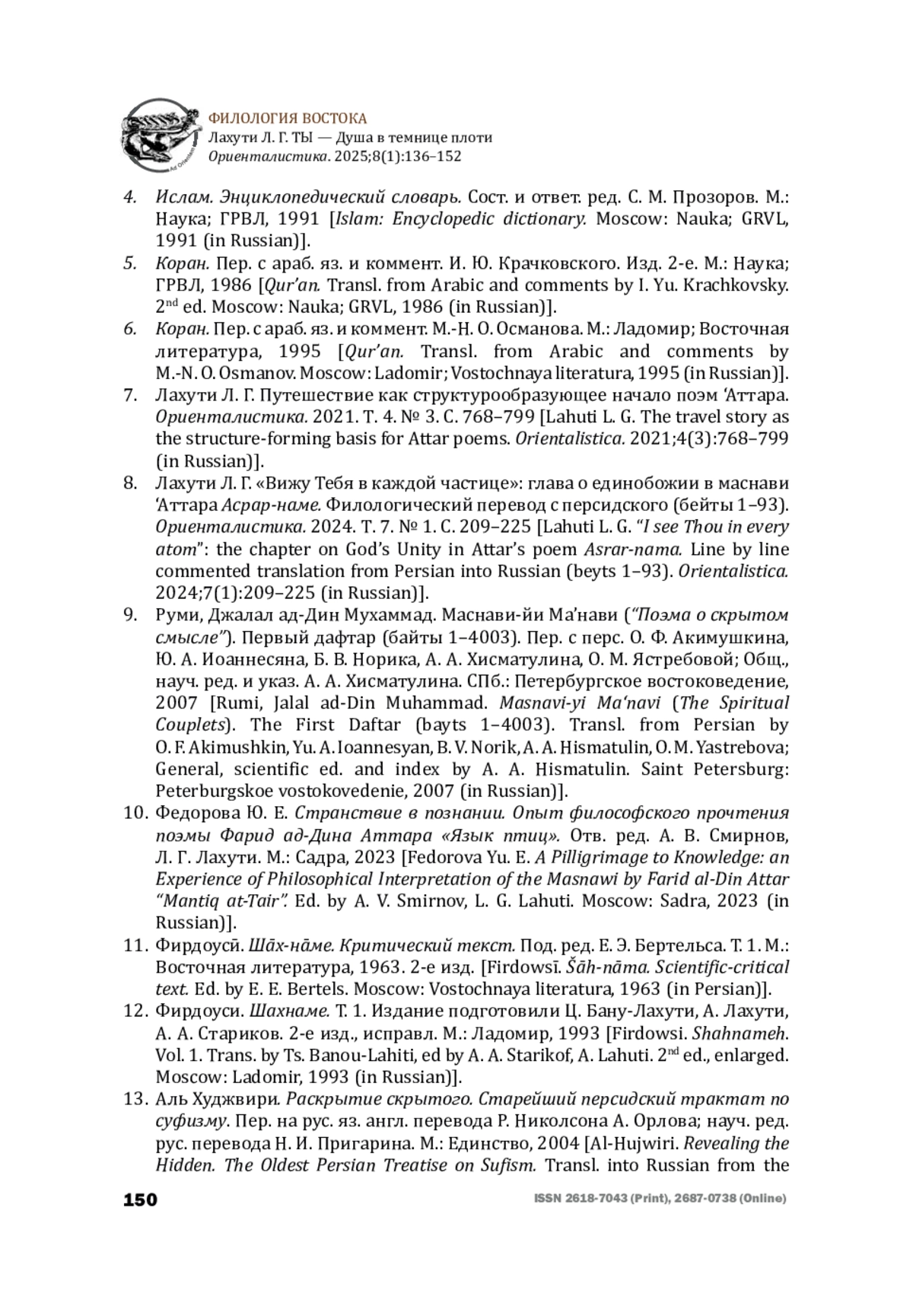 7. Лахути Л. Г. Путешествие как структурообразующее начало поэм ‘Аттара. Ориенталистика. 2021. Т. 4. № 3. С. 768-799 [Lahuti L. G. The travel story as the structure-forming basis for Attar poems. Orientalistica. 2021;4(3):768-799 (in Russian)].