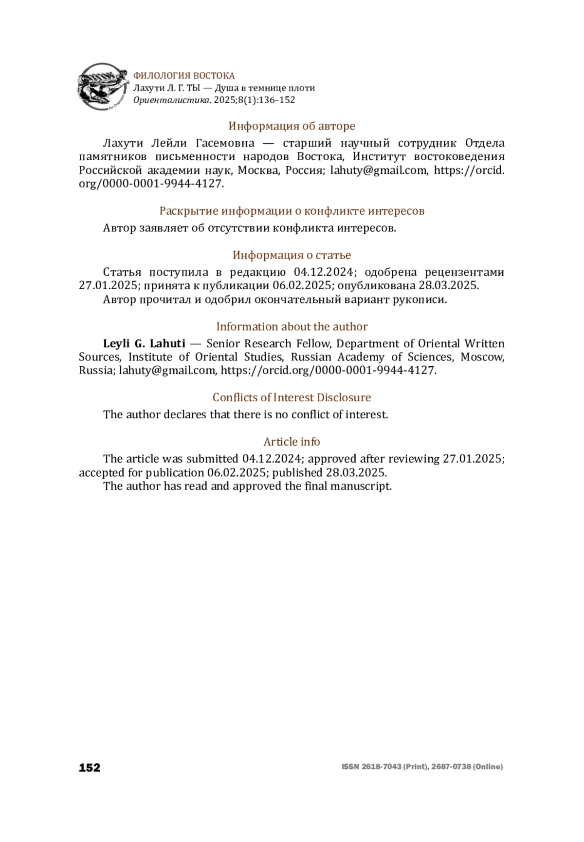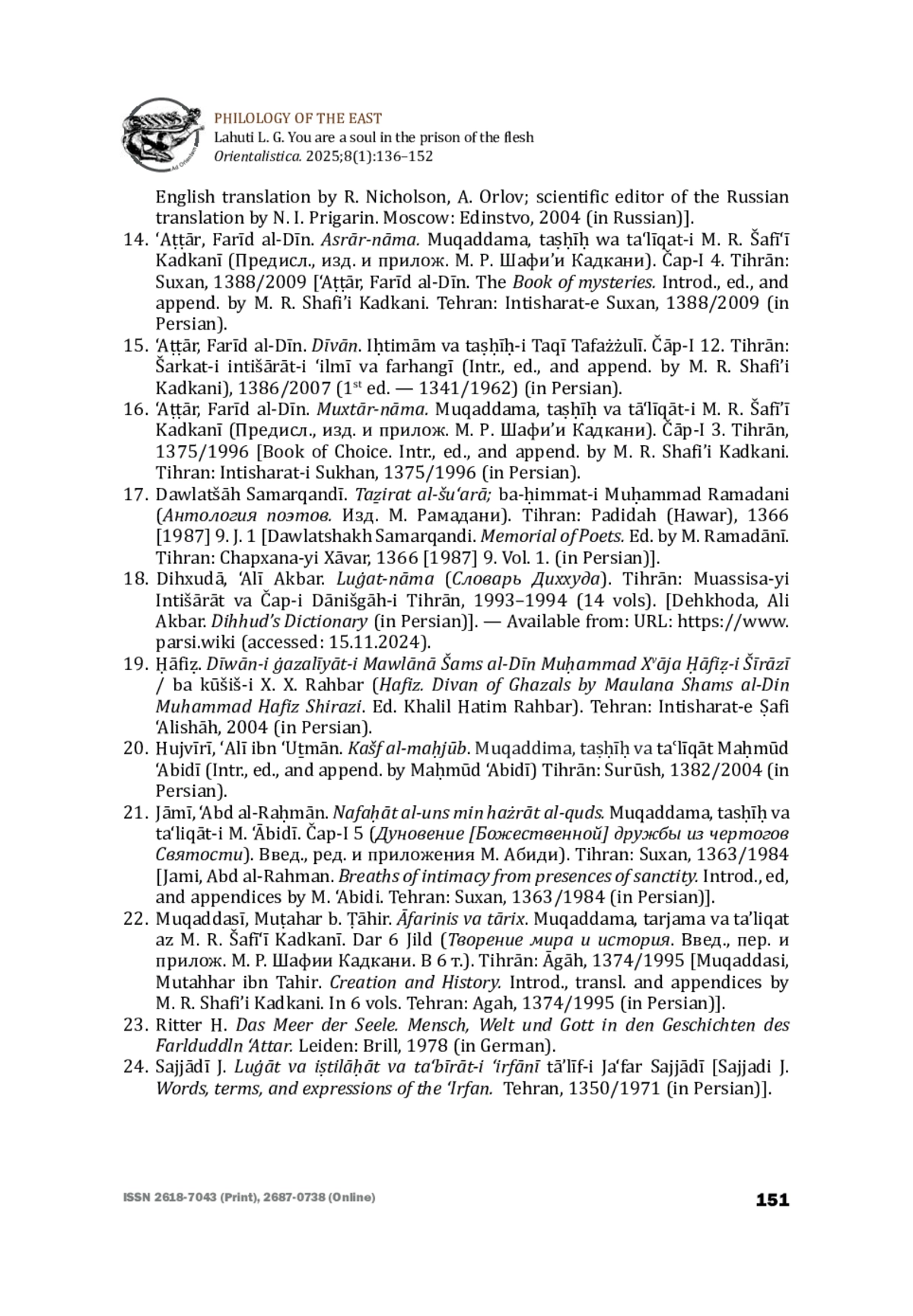 8. Лахути Л. Г. “Вижу Тебя в каждой частице”: глава о единобожии в маснави ‘Аттара Асрар-наме. Филологический перевод с персидского (бейты 1-93). Ориенталистика. 2024. Т. 7. № 1. С. 209-225 [Lahuti L. G. “I see Thou in every atom”: the chapter on God’s Unity in Attar’s poem Asrar-nama. Line by line commented translation from Persian into Russian (beyts 1-93). Orientalistica. 2024;7(1):209-225 (in Russian)].