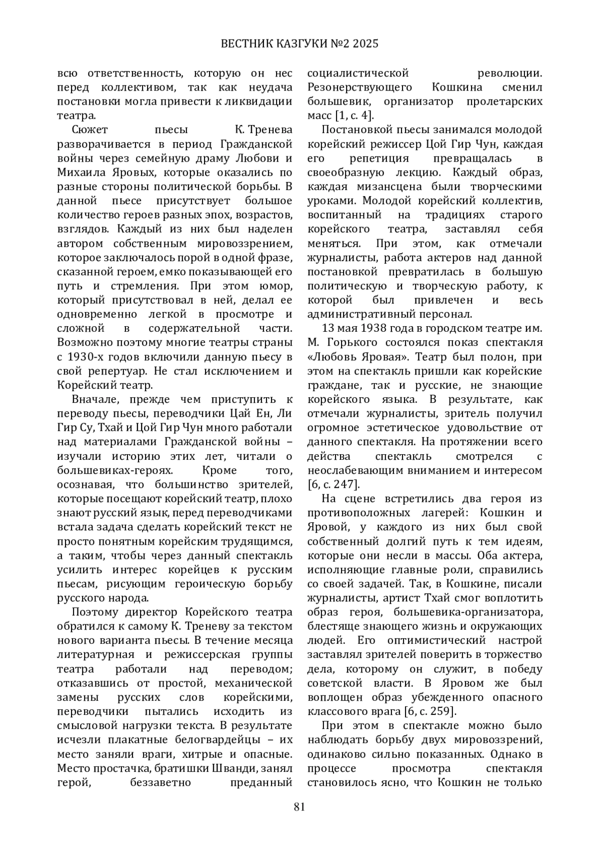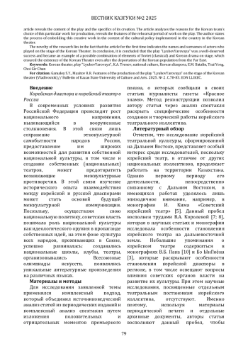 В статье рассматриваются особенности постановки спектакля Регионального корейского театра «Любовь Яровая».