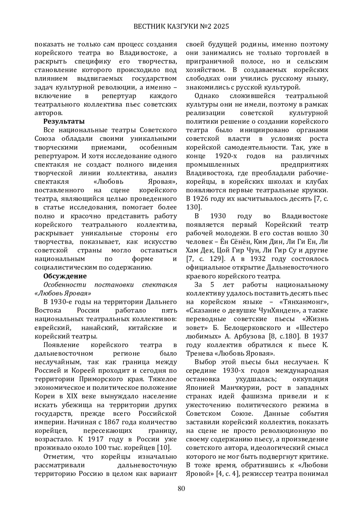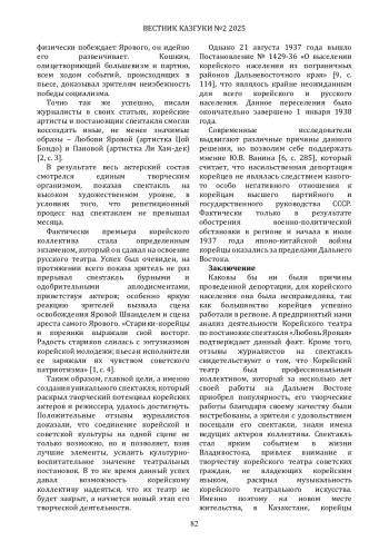 Целью исследования стало изучение и анализ особенностей спектакля «Любовь Яровая», поставленного в 1937 году на сцене Корейского театра во Владивостоке по одноимённой пьесе К. А. Тренёва. И хотя этот спектакль входил в репертуар многих театров советской страны, в том числе национальных, его постановка на сцене корейского театра вызвала большой интерес у зрителей, так как продемонстрировала изменения в репертуарной политике национальных коллективов в сторону реализации тезиса о том, что «искусство должно быть национальным по форме и социалистическим по содержанию». Для достижения этой цели автор статьи раскрывает содержание пьесы и специфику её создания. В статье анализируются причины выбора корейским коллективом именно этого произведения для постановки, раскрываются особенности репетиционного периода работы над спектаклем. Автор констатирует процесс встраивания данной творческой работы в контекст проводимой в стране культурной политики в корейском театре.