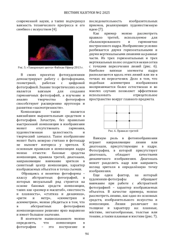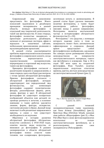 В данной статье абстрактная фотография рассматривается как отдельный вид изобразительного искусства, основанный на трансформации фотографического изображения в графический художественный образ, который достигается при помощи нестандартной точки съемки, изменения технических аспектов фокуса и экспозиции или манипулирования светом. Описываются истоки зарождения экспериментальной фотографии, опыты известных художников, осуществлявших поиски новых выразительных средств в области искусства и дизайна. Соответственно основными задачами явилось освещение истоков зарождения абстрактной фотографии, эксперименты, проводимые с фотографией, а также разбор современных подходов и приемов. Определены технологии и научные разработки в данном направлении, сделана попытка аргументировать взаимосвязь технического прогресса и художественной идеи. Приведены примеры нестандартного видения предметов и объектов, предложено оригинальное решение художественного замысла. Данная статья может быть интересна фотохудожникам и дизайнерам, изучающим новые подходы в абстрактной фотографии.