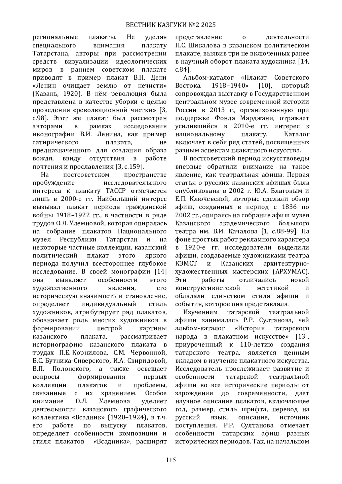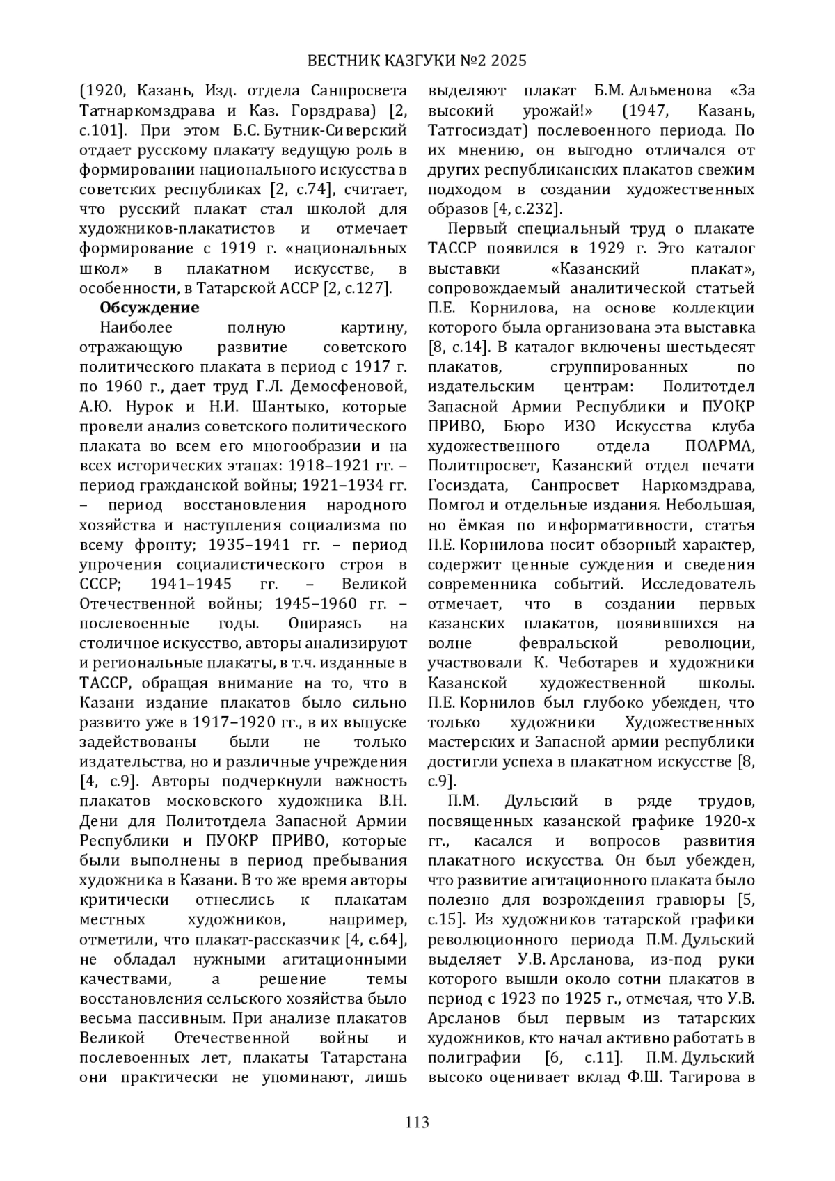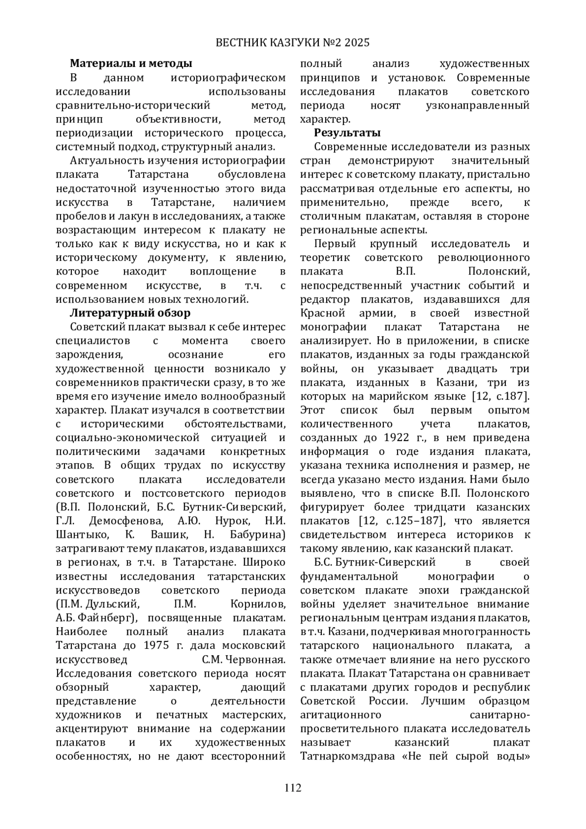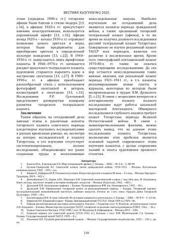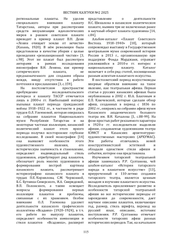Целью данного исследования является историографический анализ научных трудов, посвященных плакатному искусству Татарстана советского периода. Автор исследует особенности современных зарубежных исследований советского плаката, выделяет основные группы трудов, в которых в большей или меньшей степени затрагиваются вопросы развития плаката советского Татарстана. Автор отмечает, что в постсоветский период исследования плакатного искусства отличаются более тщательным и всесторонним подходом, глубоким осмыслением исторического контекста, художественных особенностей и стилистических принципов плаката, выделяя исследования плаката 1920-х гг. О. Л. Улемновой и татарской театральной афиши Р. Р. Султановой. Автором выявлены лакуны в изучении плаката советского Татарстана и намечены направления дальнейших исследований.