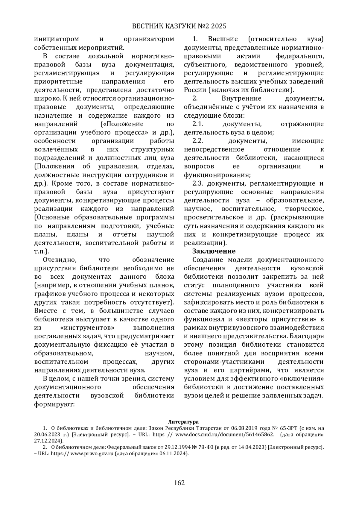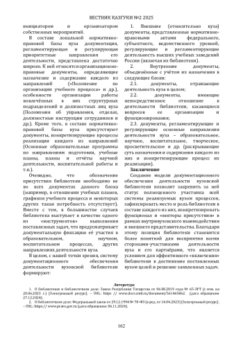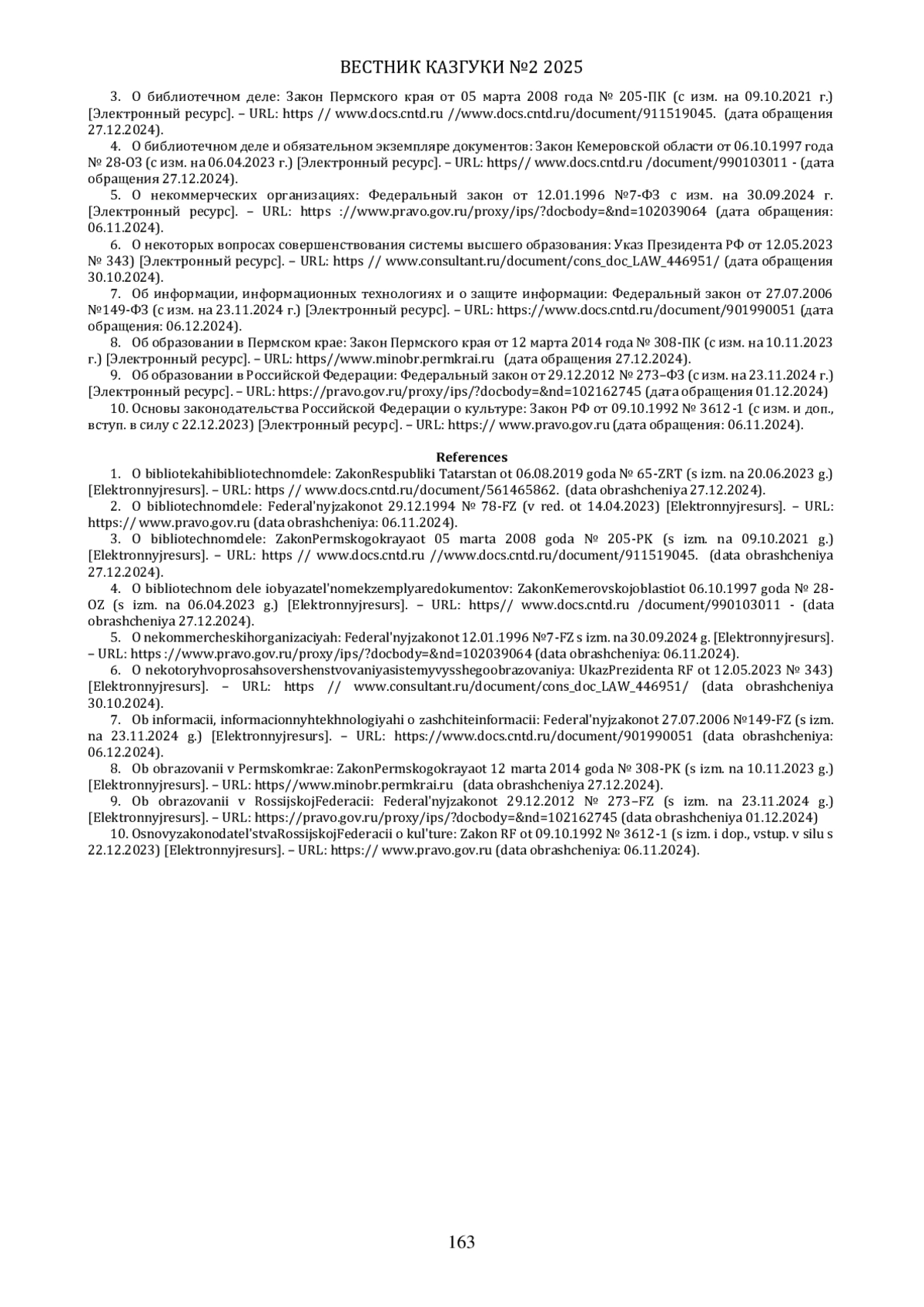 1. О библиотеках и библиотечном деле: Закон Республики Татарстан от 06.08.2019 года № 65-ЗРТ (с изм. на 20.06.2023 г.) [Электронный ресурс]. - URL: https //www.docs.cntd.ru/document/561465862. (дата обращения 27.12.2024).