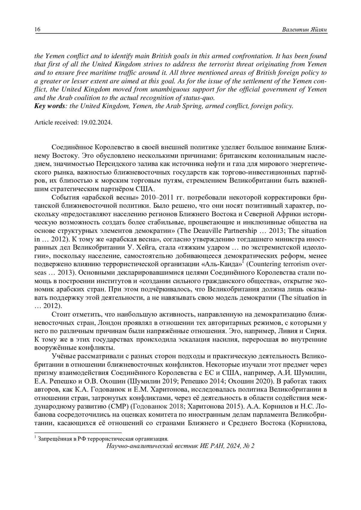 37. Гришин, Я.Я. Климов, Е.А. (2022). Внешняя политика Великобритании на Аравийском на-правлении (2010-2022 годы) // Международные отношения и общество 4(1): 80-92. EDN: EGQLYD