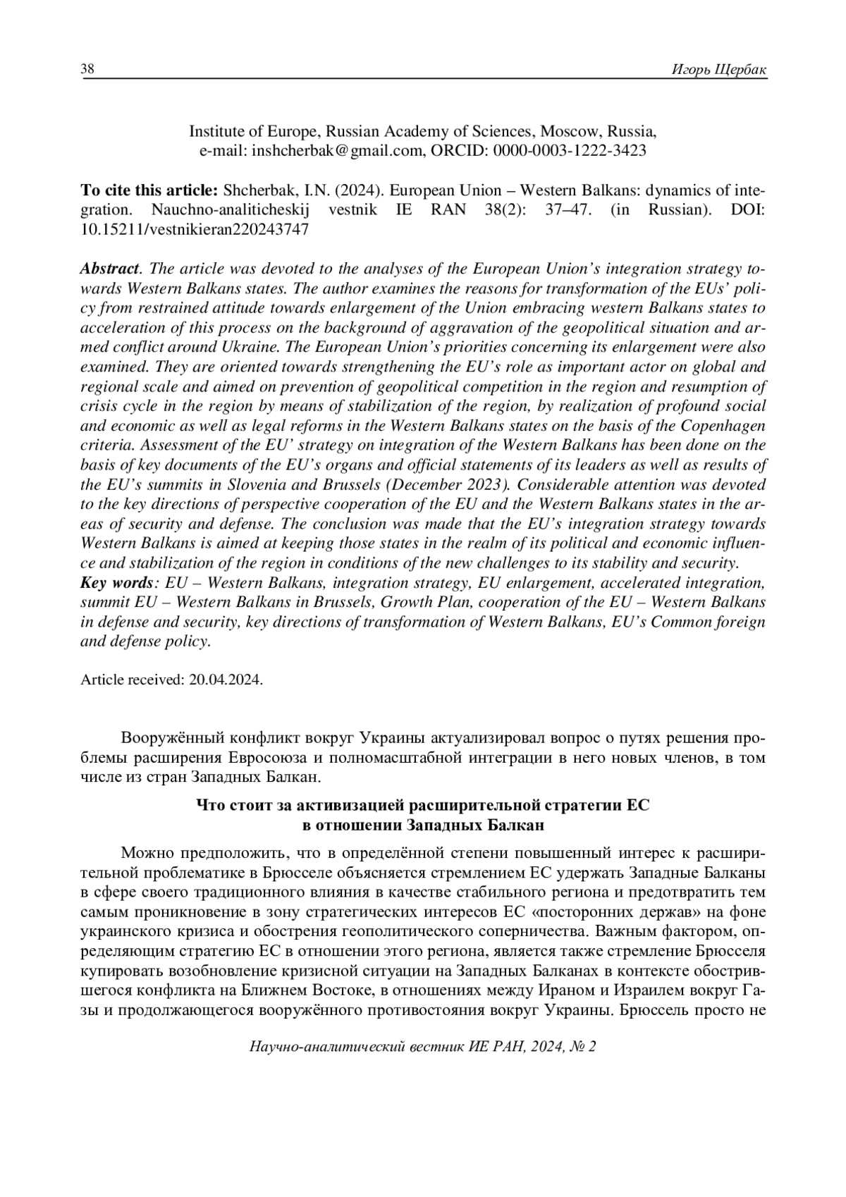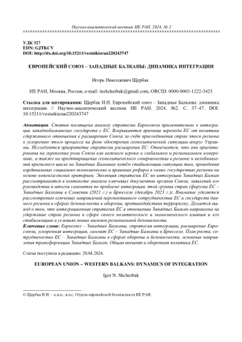 Статья посвящена анализу стратегии Евросоюза применительно к интеграции западнобалканских государств с ЕС. Вскрываются причины перехода ЕС от политики сдержанного отношения к расширению Союза за счёт присоединения стран этого региона к ускорению этого процесса на фоне обострения геополитической ситуации вокруг Украины. Исследуются приоритеты стратегии расширения ЕС. Отмечается, что они ориентированы на укрепление роли Союза как важного игрока в глобальном и региональном измерениях, а также на предотвращение геополитического соперничества в регионе и возобновления кризисного цикла на Западных Балканах путём стабилизации ситуации там, проведения кардинальных социально-экономических и правовых реформ в самих государствах региона на основе копенгагенских критериев. Эволюция стратегии ЕС по интеграции Западных Балкан рассматривается в контексте анализа ключевых документов органов Союза, заявлений его руководства и итогов саммитов по проблеме интеграции этой группы стран (форумы ЕС – Западные Балканы в Словении (2021 г.) и Брюсселе (декабрь 2023 г.)). Внимание уделяется рассмотрению ключевых направлений перспективного сотрудничества ЕС и государств данного региона в сферах безопасности и обороны, противодействия терроризму. Делается вывод о том, что интеграционная стратегия ЕС в отношении Западных Балкан направлена на удержание стран региона в сфере своего политического и экономического влияния и его стабилизацию в условиях новых вызовов региональной безопасности