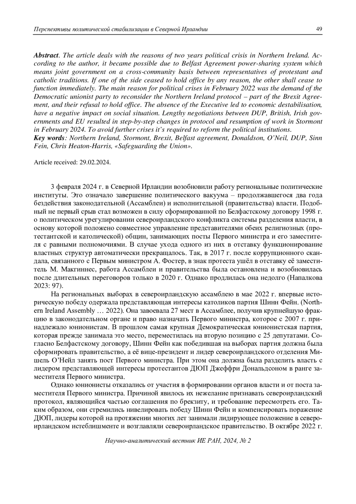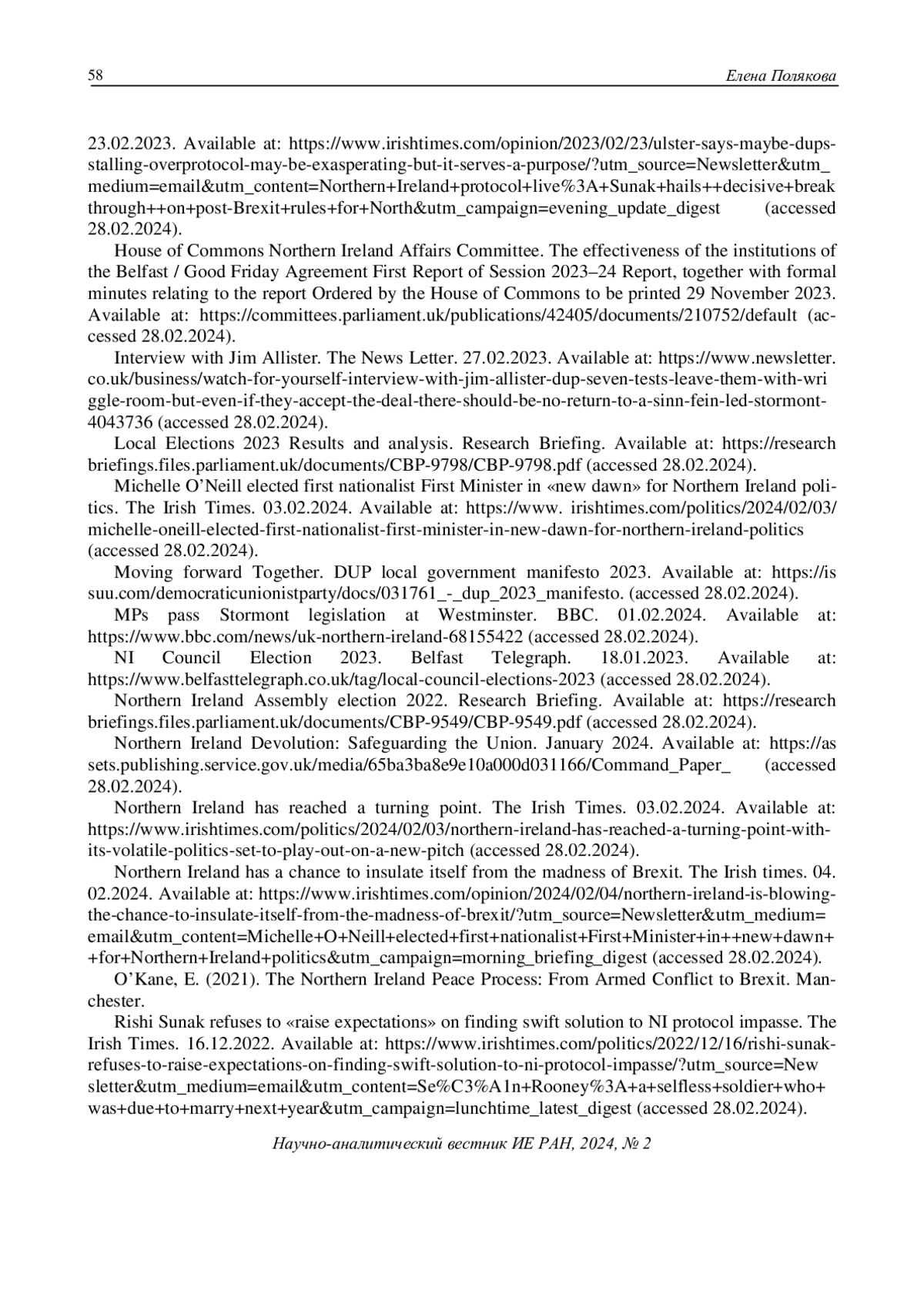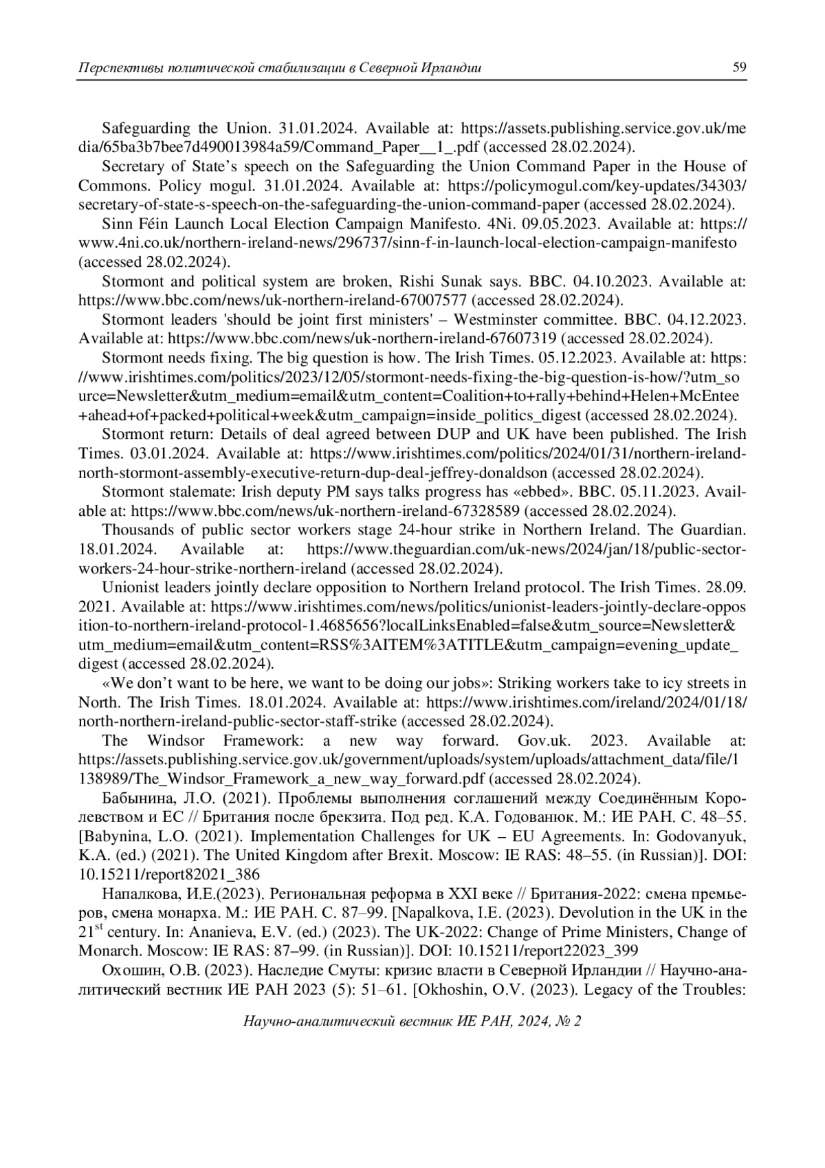 40. Охошин, О.В. (2023). Наследие Смуты: кризис власти в Северной Ирландии // Научно-аналитический вестник ИЕ РАН 2023 (5): 51-61. EDN: IMTIQJ