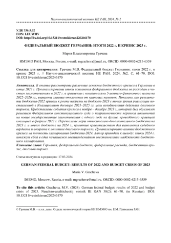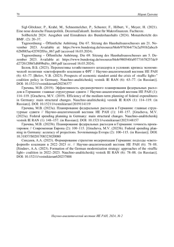 Gracheva, M.V. (2023а). Federal spending planning in Germany: main structural changes. Nauchno-analiticheskij vestnik IE RAN (1): 148-157. (in Russian). DOI: 10.15211/vestnikieran12023148157 EDN: LBASEE