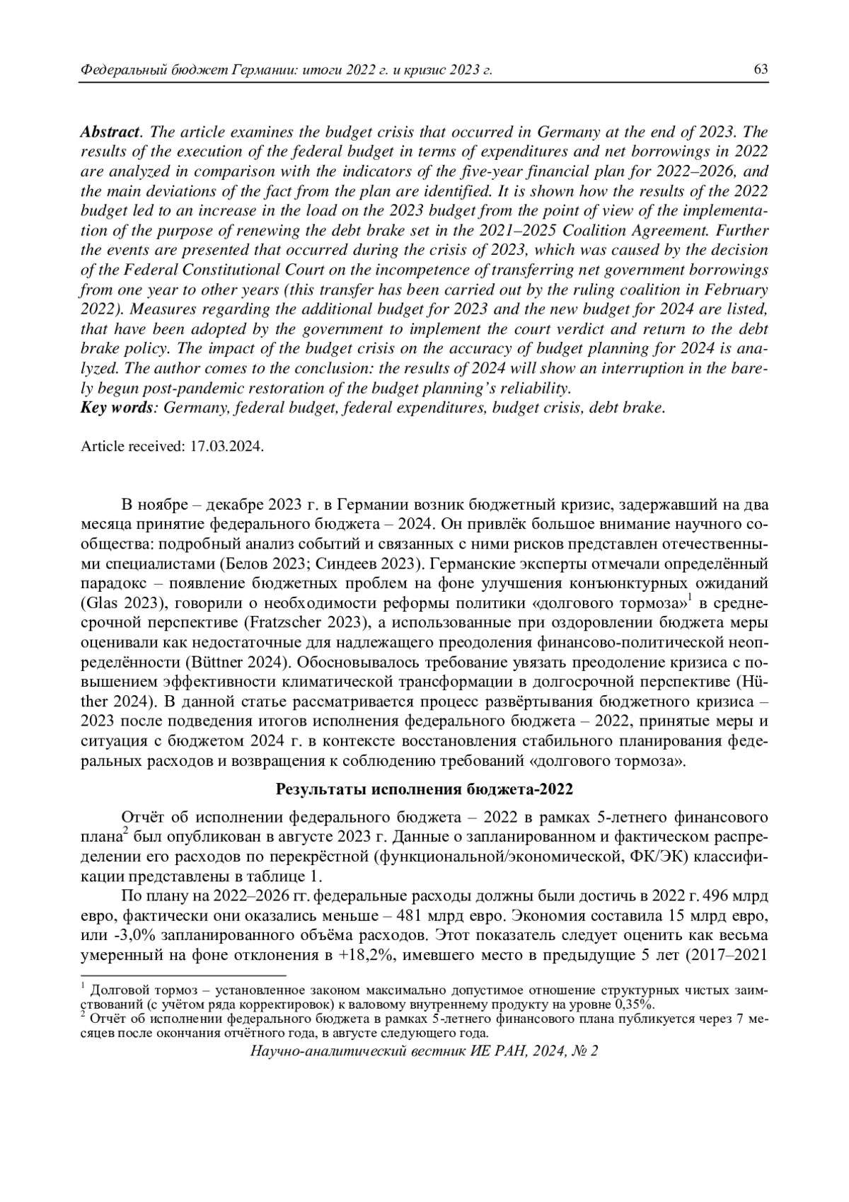 В ноябре – декабре 2023 г. в Германии возник бюджетный кризис, задержавший на два месяца принятие федерального бюджета – 2024. Он привлёк большое внимание научного сообщества: подробный анализ событий и связанных с ними рисков представлен отечественными специалистами (Белов 2023; Синдеев 2023). Германские эксперты отмечали определённый парадокс – появление бюджетных проблем на фоне улучшения конъюнктурных ожиданий (Glas 2023), говорили о необходимости реформы политики «долгового тормоза»1 в среднесрочной перспективе (Fratzscher 2023), а использованные при оздоровлении бюджета меры оценивали как недостаточные для надлежащего преодоления финансово-политической неопределённости (Büttner 2024). Обосновывалось требование увязать преодоление кризиса с повышением эффективности климатической трансформации в долгосрочной перспективе (Hü- ther 2024). В данной статье рассматривается процесс развёртывания бюджетного кризиса – 2023 после подведения итогов исполнения федерального бюджета – 2022, принятые меры и ситуация с бюджетом 2024 г. в контексте восстановления стабильного планирования федеральных расходов и возвращения к соблюдению требований «долгового тормоза»