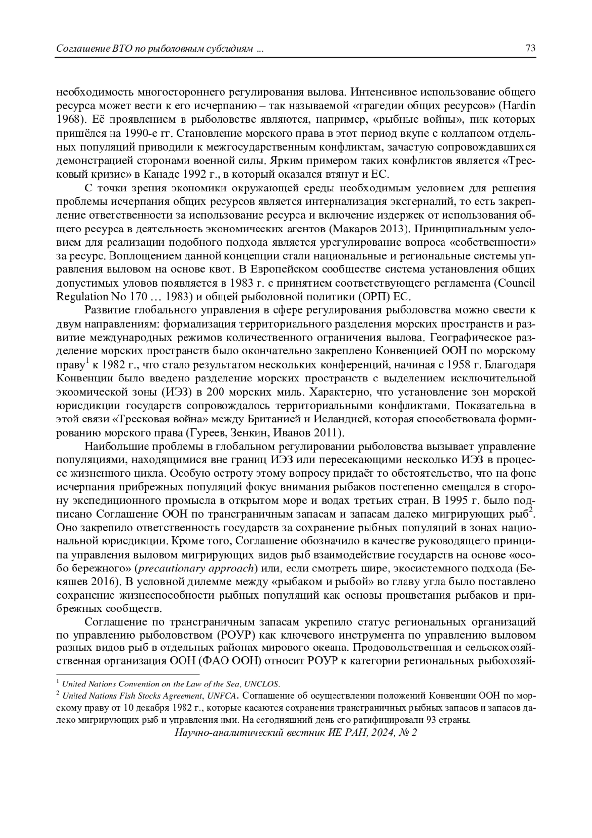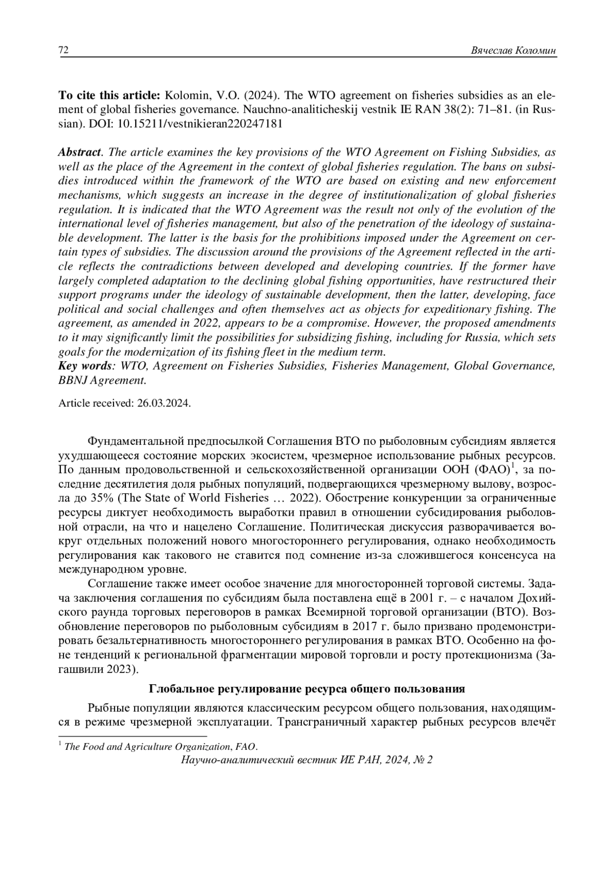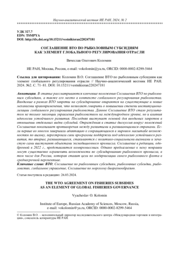 В статье рассматриваются ключевые положения Соглашения ВТО по рыболовным субсидиям, а также его место в контексте глобального регулирования рыболовства. Вводимые в рамках ВТО запреты на субсидирование опираются на существующие и новые механизмы правоприменения, что позволяет говорить о повышении степени институционализации глобального регулирования рыболовства. Данное Соглашение ВТО стало результатом не только эволюции управления рыболовством на международном уровне, но и влияния идеологии устойчивого развития. Последняя выступает основой для вводимых запретов в отношении отдельных видов субсидий. Отражённая в статье дискуссия вокруг положений Соглашения показывает противоречия между развитыми и развивающимися странами. Если первые во многом завершили адаптацию к сокращающимся в мировом масштабе возможностям по вылову, перестроили свои программы поддержки под идеологию устойчивого развития, то вторые, развивающиеся, стакиваются с политико-социальными вызовами и зачастую сами выступают объектами экспедиционного промысла. Соглашение в редакции, одобренной в 2022 г., представляется компромиссным. Однако предлагаемые к нему поправки могут существенно ограничить возможности по субсидированию рыболовного промысла, в том числе для России, которая ставит цели по модернизации своего рыболовного флота в среднесрочной перспективе.
