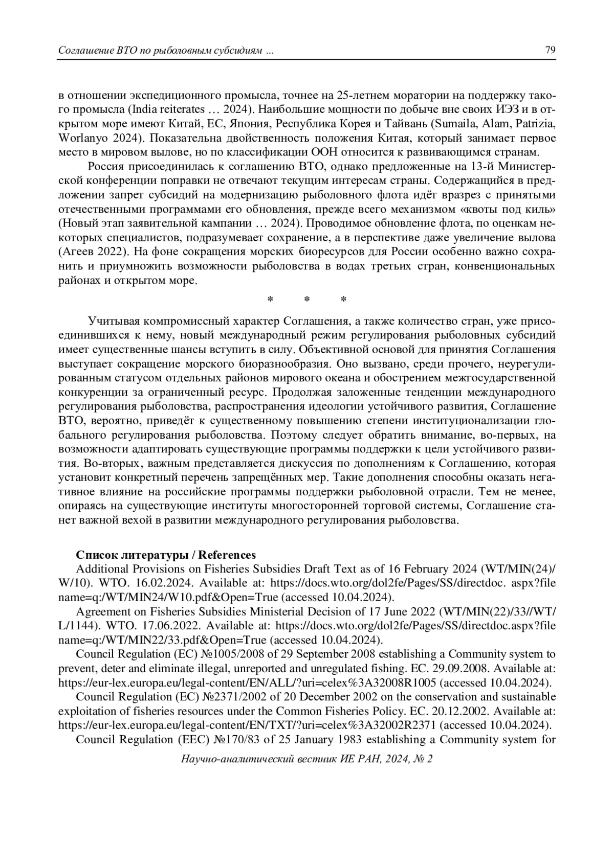 1. Additional Provisions on Fisheries Subsidies Draft Text as of 16 February 2024 (WT/MIN(24)/ W/10). WTO. 16.02.2024. Available at: https://docs.wto.org/dol2fe/Pages/SS/directdoc.aspx?filename=q:/WT/MIN24/W10.pdf&Open=True (accessed 10.04.2024).