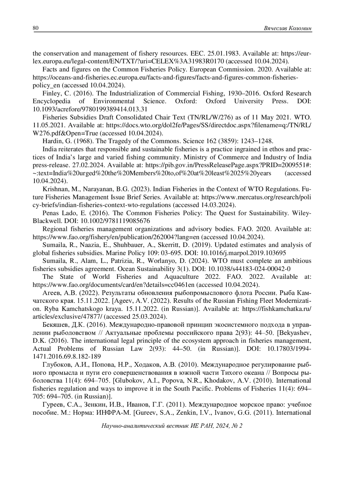 11. Krishnan, M., Narayanan, B.G. (2023). Indian Fisheries in the Context of WTO Regulations. Fu-ture Fisheries Management Issue Brief Series. Available at: https://www.mercatus.org/research/policy-briefs/indian-fisheries-context-wto-regulations (accessed 14.03.2024).