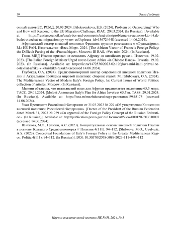 41. Шибкова, М.О., Гулюки, А.С. (2023). Концептуальные основы внешней политики Италии в регионе Большого Средиземноморья // Полития 4(111): 94-112. EDN: EGLKNV
