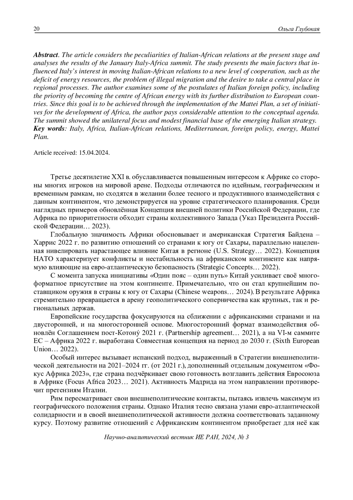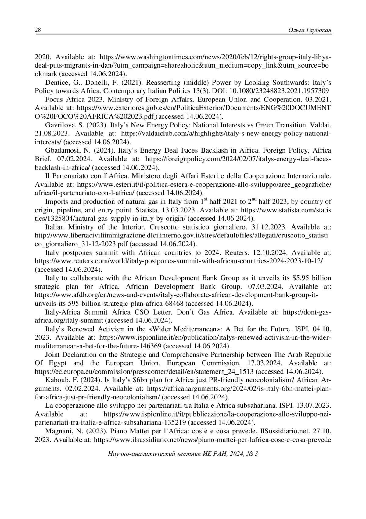 9. Gbadamosi, N. (2024). Italy’s Energy Deal Faces Backlash in Africa. Foreign Policy, Africa Brief. 07.02.2024. Available at: https://foreignpolicy.com/2024/02/07/italys-energy-deal-faces-backlash-in-africa/(accessed 14.06.2024).
