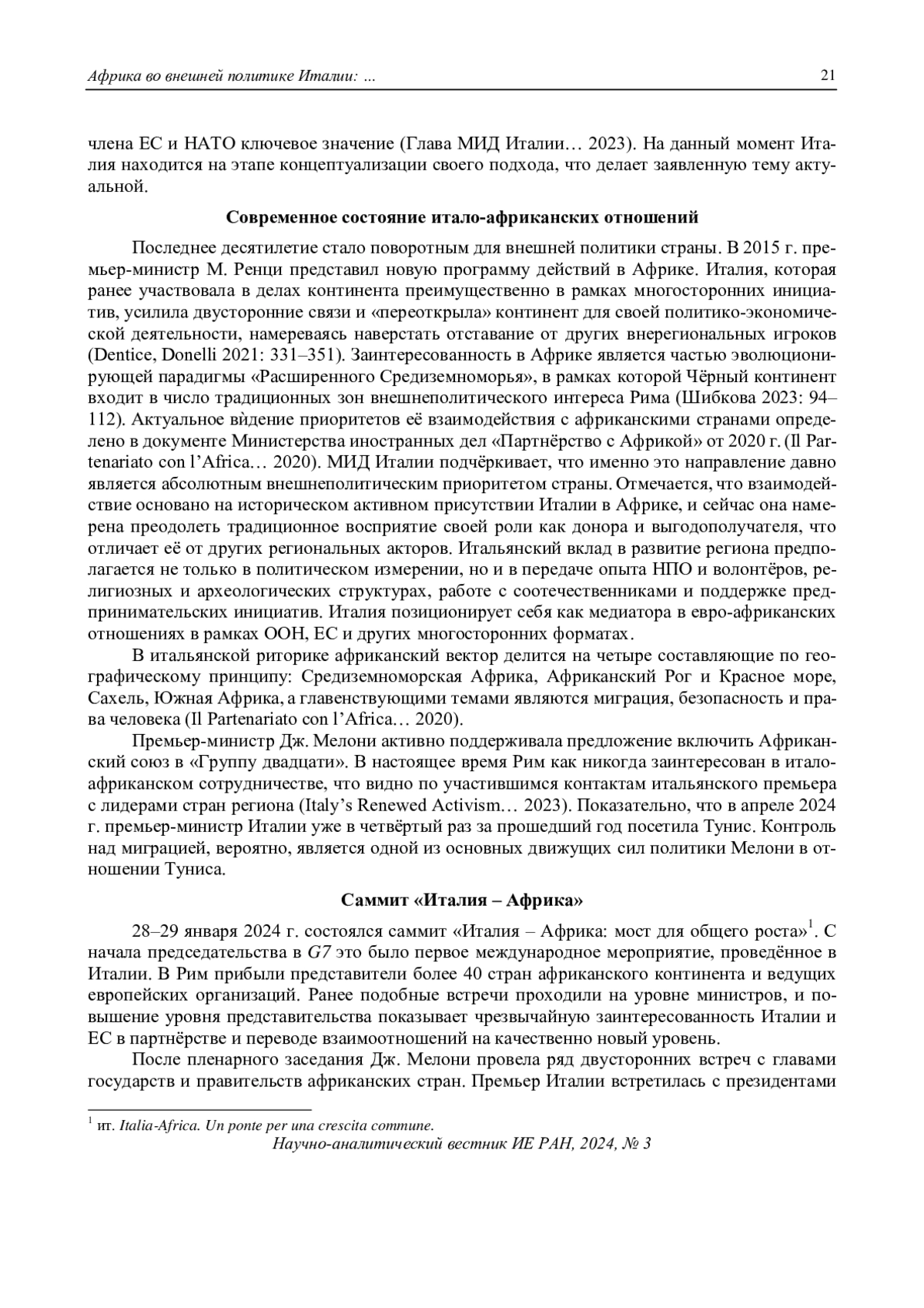 6. Dentice, G., Donelli, F. (2021). Reasserting (middle) Power by Looking Southwards: Italy’s Policy towards Africa. Contemporary Italian Politics 13(3). DOI: 10.1080/23248823.2021.1957309 EDN: RIGTYV