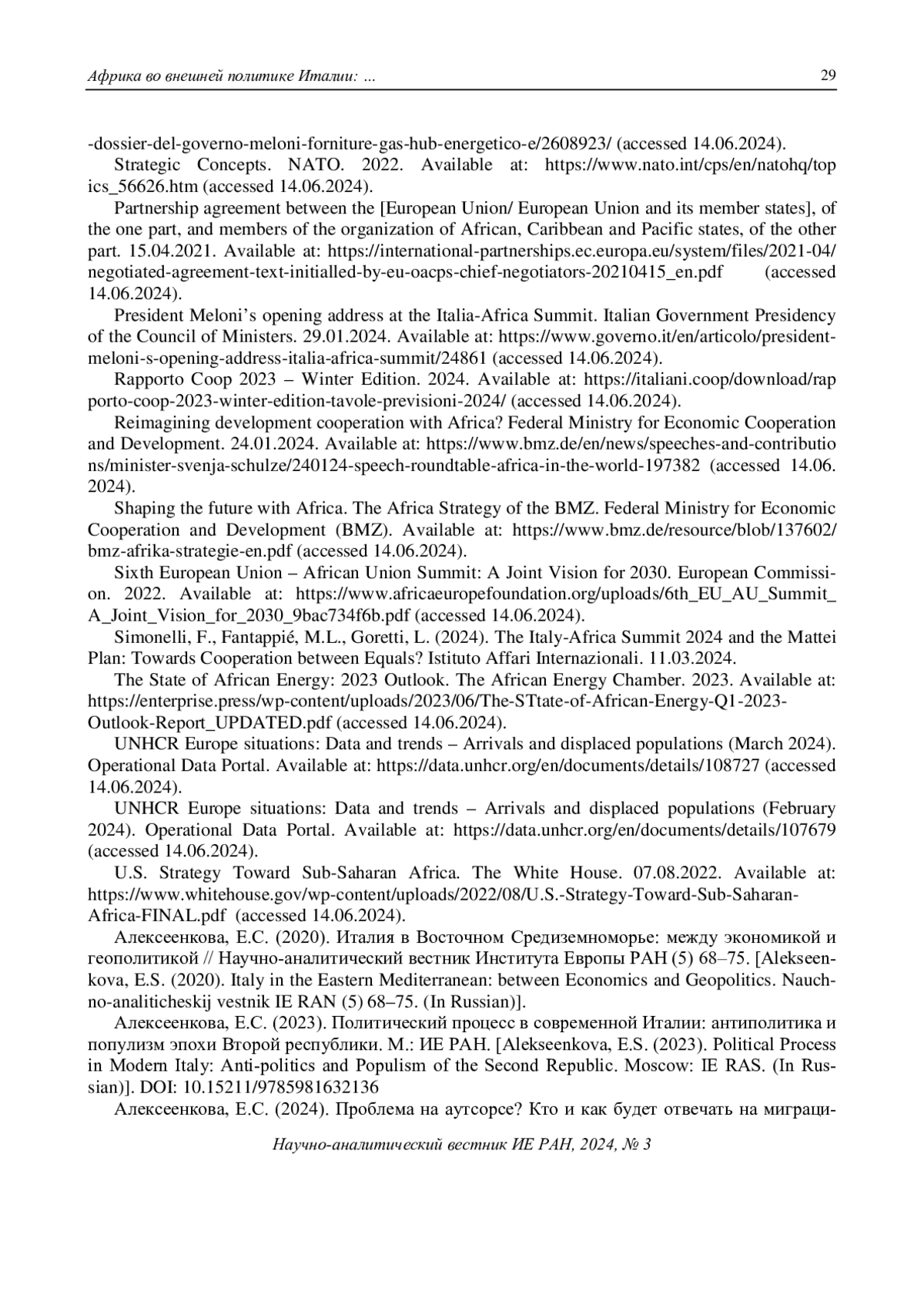 23. President Meloni’s opening address at the Italia-Africa Summit. Italian Government Presidency of the Council of Ministers. 29.01.2024. Available at: https://www.governo.it/en/articolo/president-meloni-s-opening-address-italia-africa-summit/24861 (accessed 14.06.2024).