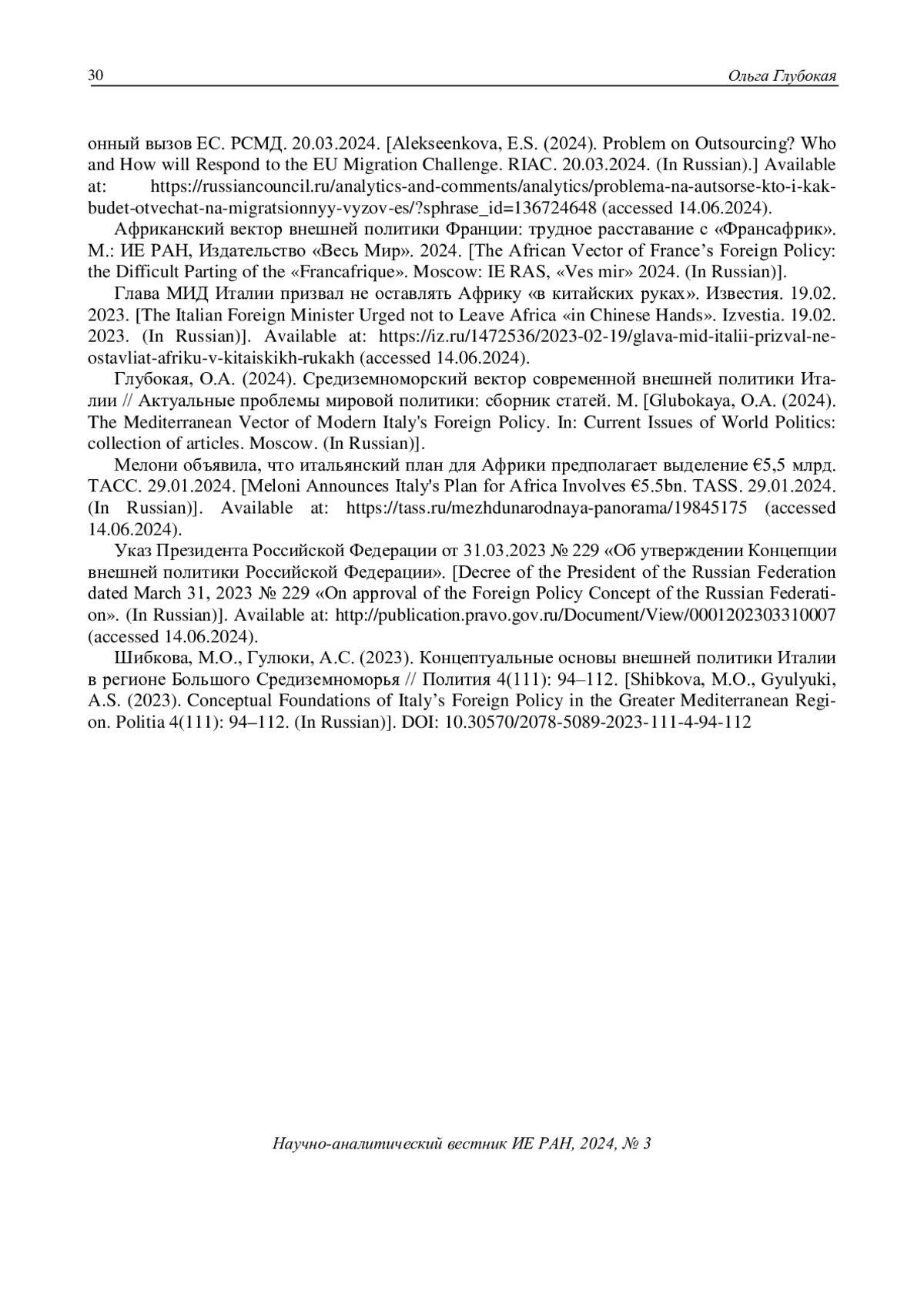 Glubokaya, O.A. (2024). The Mediterranean Vector of Modern Italy’s Foreign Policy. In: Current Issues of World Politics: collection of articles. Moscow. (In Russian).