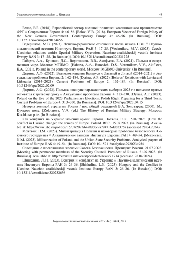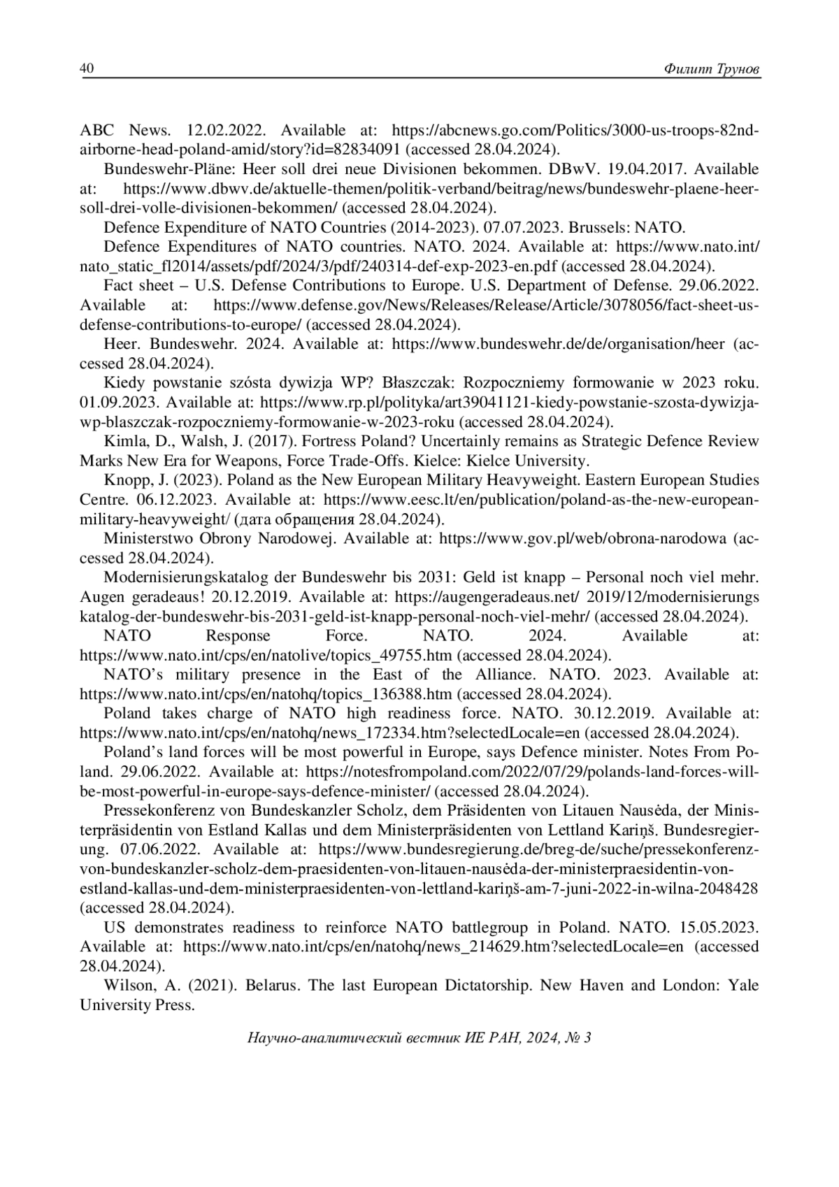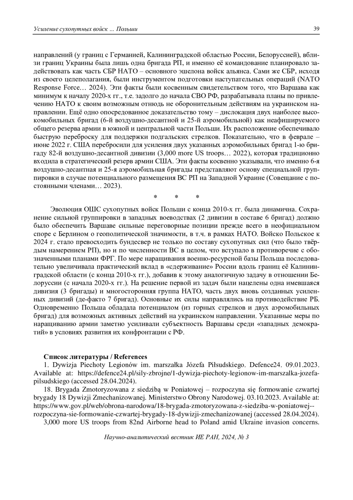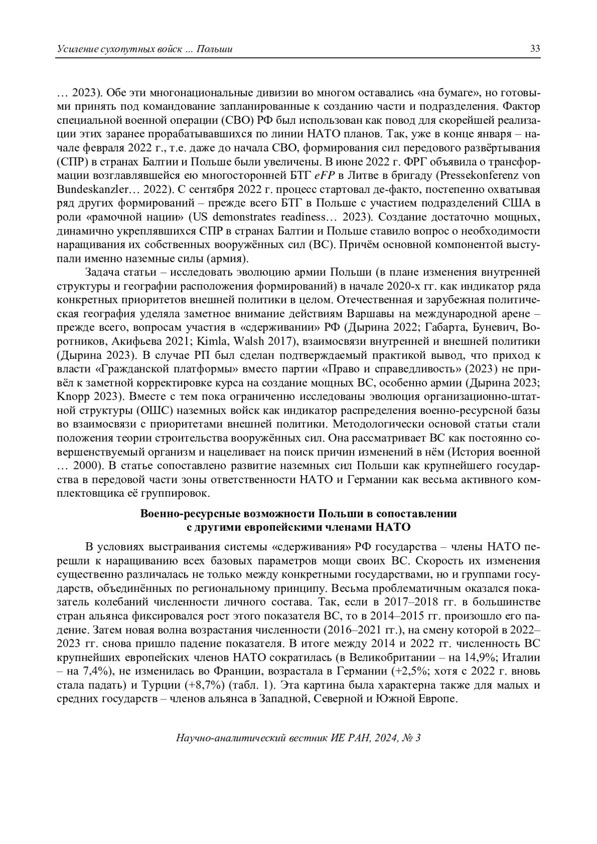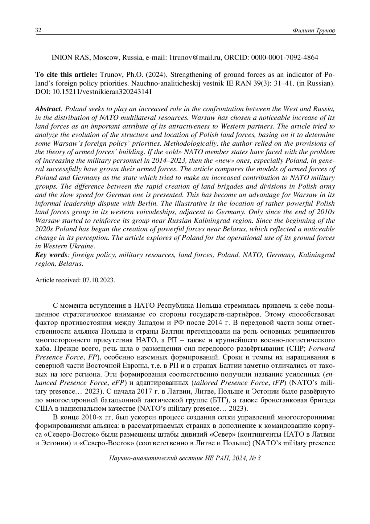 Польша стремится играть активную роль в конфронтации Запада с РФ, в частности, в том, что касается распределения его многосторонних ресурсов. Важным атрибутом своей привлекательности для партнёров Варшава избрала наращивание сухопутных войск. Посредством анализа эволюции их внутренней структуры и дислокации автор предпринимает попытку выявить приоритеты внешней политики Республики Польши (РП) в начале 2020-х гг. Методологически автор опирается на положения теории строительства вооружённых сил (ВС). Если «старые» государства – члены НАТО столкнулись с большими сложностями касательно увеличения численности личного состава в 2014–2023 гг., то «новые», особенно РП, в целом уверенно шли по пути его заметного наращивания. В статье сопоставлены модели развития наземных сил Польши и Германии – последняя пыталась нести повышенную нагрузку при комплектовании группировок НАТО. Показана ставшая в начале 2020-х гг. заметной разница с бундесвером в скорости создания новых наземных бригад и дивизий в Войске Польском, увеличении общей численности ВС. Этот факт обеспечивал Варшаве переговорное преимущество в неофициальном споре о лидерстве с Берлином. Показательно и сохранение сильной сухопутной группировки в западных воеводствах РП, сопредельных с Германией. Лишь с конца 2010-х гг. Варшава приступила к усилению своих войск у границ Калининградской области РФ. С начала 2020-х гг. стали создаваться мощные силы вблизи Беларуси, что отражало заметное изменение восприятия этой страны Варшавой. В статье рассматриваются возможности Польши по оперативному использованию сухопутных войск на Западной Украине.