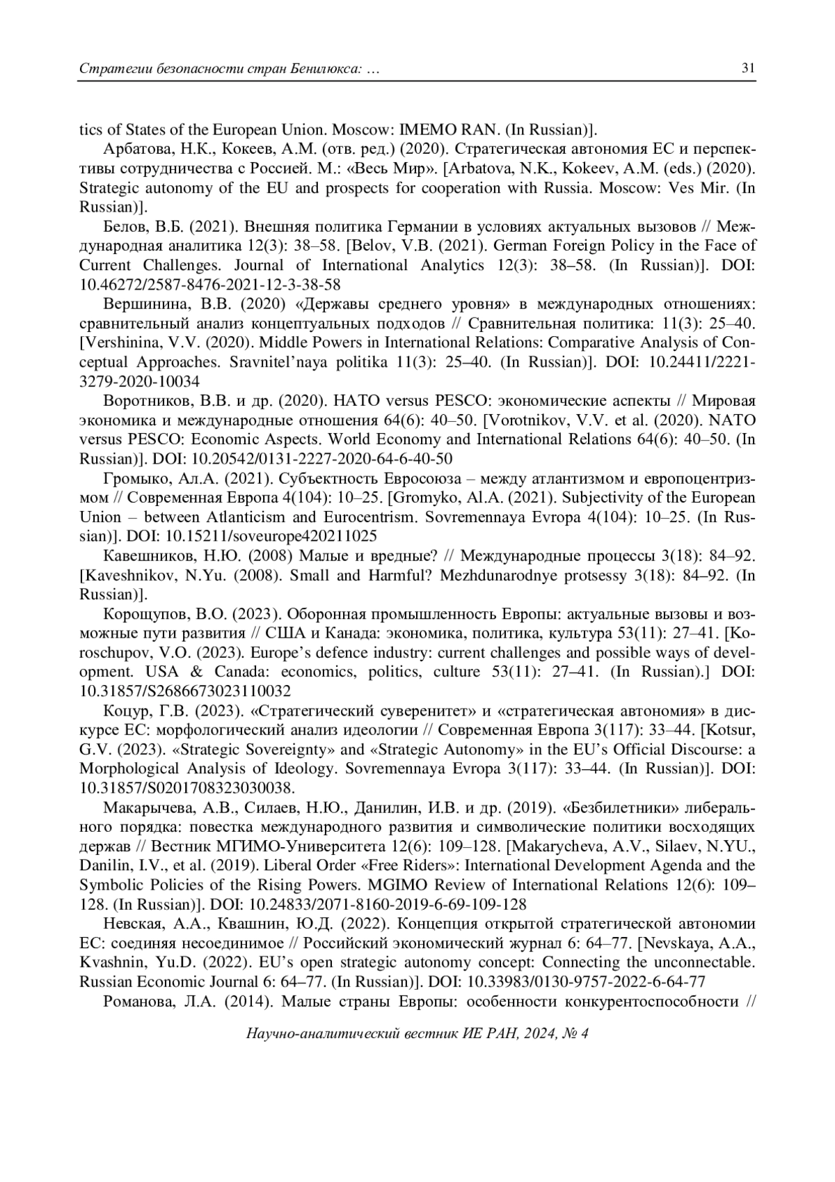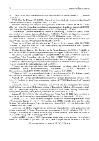 56. Арбатова, Н.К., Кокеев, А.М. (отв. ред.) (2020). Стратегическая автономия ЕС и перспективы сотрудничества с Россией. М.: “Весь Мир”.