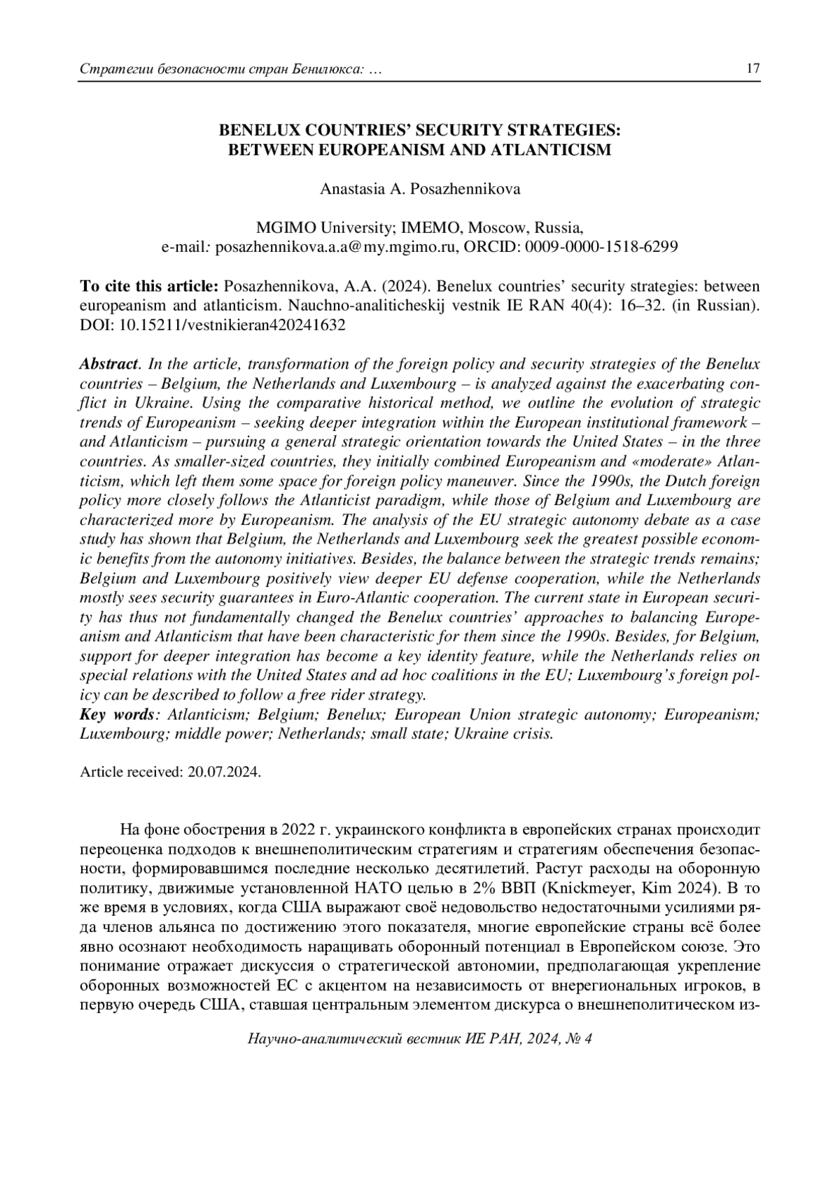 Статья посвящена трансформации стратегий в сферах внешней политики и безопасности стран Бенилюкса – Бельгии, Нидерландов и Люксембурга – на фоне обострения украинского конфликта. Изложена эволюция стратегических тенденций европеизма (стремления к углублению взаимодействия в рамках евроинтеграционных институтов) и атлантизма (общей стратегической ориентации на США). Страны Бенилюкса изначально сочетали европеизм и «умеренный» атлантизм, оставлявший им некоторое пространство для внешнеполитического манёвра. С 1990-х гг. внешняя политика Нидерландов проводится, скорее, в парадигме атлантизма, тогда как для Бельгии и Люксембурга характерно преобладание европеизма. Анализ дискуссии о стратегической автономии ЕС показал, что Бельгия, Нидерланды и Люксембург стремятся извлечь наибольшую экономическую выгоду из инициатив в рамках данной концепции. Но стратегические предпочтения сохраняются: Бельгия и Люксембург воспринимают углубление оборонного сотрудничества в ЕС положительно, а Нидерланды в качестве гарантии безопасности страны более склонны видеть евро-атлантическое сотрудничество. Таким образом, даже нынешняя международная ситуация принципиально не изменила соотношения элементов европеизма и атлантизма в стратегиях безопасности, характерного для каждой из стран с 1990-х гг. Если для Бельгии поддержка углубления интеграции стала важнейшим элементом идентичности, то Нидерланды опираются на особые отношения с США и ad hoc коалиции в ЕС, а внешнюю политику Люксембурга можно описать как стратегию «безбилетника»