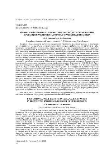 Синдром эмоционального выгорания продолжает привлекать внимание ученых и практиков, ориентированных на социально-психологическое сопровождение работников, что сопряжено с объективными масштабными изменениями, происходящими в мире, перестройкой бизнес-моделей и управленческих систем. В последние годы актуален вопрос о новых детерминантах его возникновения, поскольку своевременная профилактика способствует сохранению ключевых кадров, благоприятно сказываясь на конкурентоспособности, обеспечивая стабильность и процветание организаций в условиях «новой нормальности». Цель исследования - изучение влияния профессионального благополучия руководителей на возникновение и дальнейшее развитие симптомов эмоционального выгорания работников, находящихся в их непосредственном подчинении. В исследовании приняли участие 72 линейных менеджера и 953 сотрудника крупной финансовой компании. Для диагностики показателей применялись методика оценки профессионального благополучия (МОПБ) Е. И. Рут и опросник определения уровня эмоционального выгорания (MBI) К. Маслач и С. Джексон в адаптации Н. Е. Водопьяновой. У руководителей, принявших участие в исследовании, выявлен умеренный уровень общего профессионального благополучия, в большей степени они удовлетворены позитивными отношениями в коллективе и возможностями профессионального развития. Диагностика эмоционального выгорания подчиненных показала, что они испытывают эмоциональные нагрузки и склонны обесценивать свои профессиональные достижения. Исследование позволило определить взаимосвязь профессионального благополучия руководителей с проявлением симптомов эмоционального выгорания участников их команд. Установлено, что наибольшее влияние профессиональное благополучие оказывает на редукцию достижений подчиненных, при этом уровень удовлетворенности менеджеров своими достижениями оказывает обратное влияние на снижение профессиональной самооценки и общее выгорание подчиненных. Выявлено, что чем моложе менеджеры, тем больше в их командах сотрудников, склонных обесценивать свои успехи, при этом чем дольше они работают руководителями, тем меньше в их командах сотрудников, у которых формируется дистанцирование от коллектива и снижается желание конструктивно общаться.
