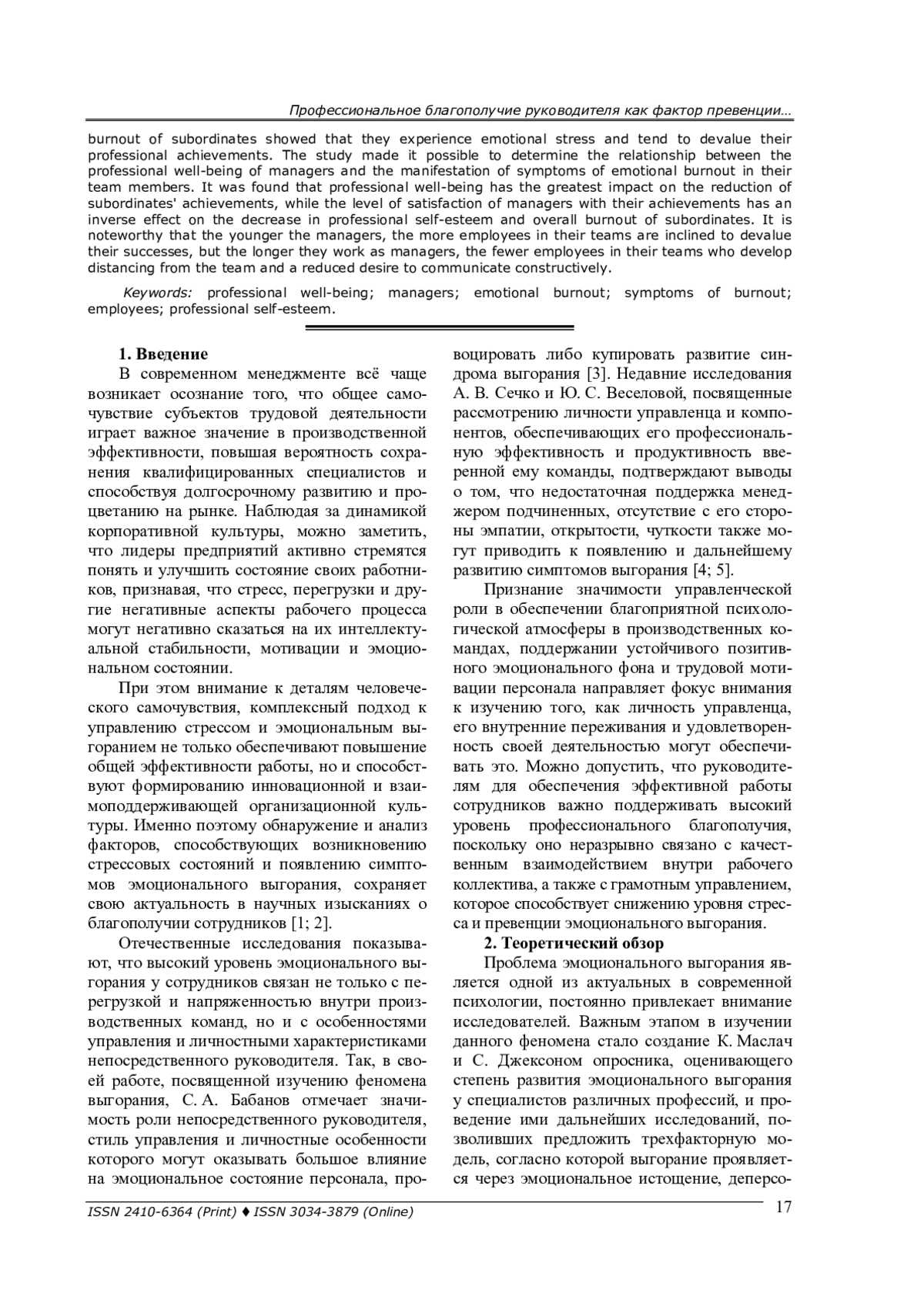 4. Сечко А. В., Абгаров А. Л. Личность руководителя в системе профилактики профессионального выгорания у педагогов общеобразовательной организации // Современные технологии управления. - 2023. - № 4 (104). - URL: https://sovman.ru/article/ 10421/(дата обращения: 15.05.2024). EDN: CYVXFA